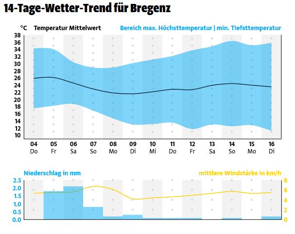 Am Donnerstag weitgehend unverändert sonniges Sommerwetter mit großer Hitze am Nachmittag. Ein isoliertes Hitzegewitter ist gegen Abend rund um das Montafon nicht ganz ausgeschlossen, wahrscheinlich bleibt es aber noch einmal trocken.