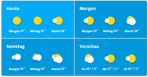 Der Sonntag wird wechselhaft mit Wolken, zeitweiligem Sonnenschein und einigen Schauern und Gewittern. Es wird schwülwarm, aber nicht mehr heiß. Die Temperaturen bewegen sich zwischen 16 und 26 Grad.