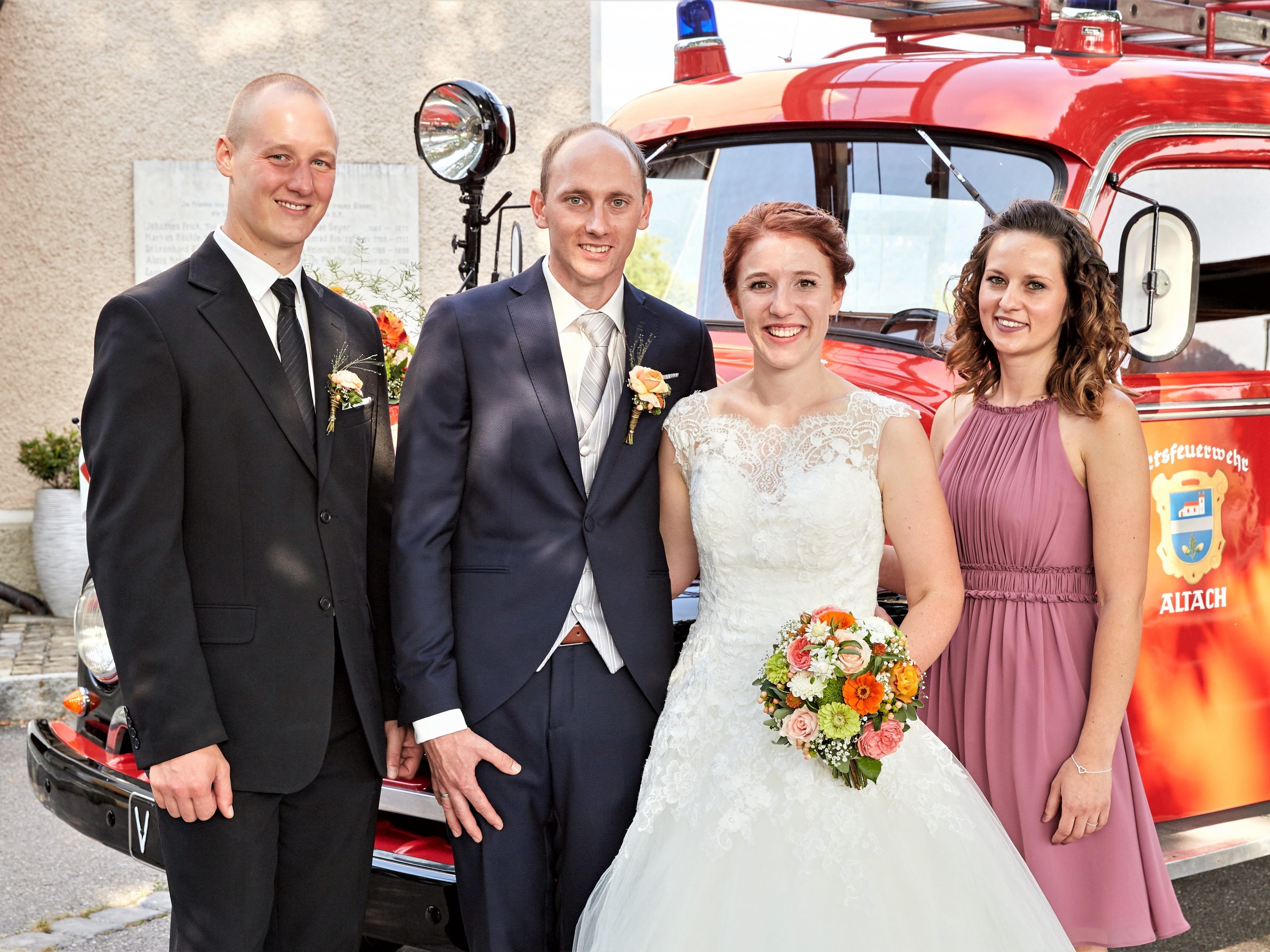 FELDKIRCH, ALTACH Das Paar aus Altach gab sich in der traumhaften Kulisse der Villa Claudia nach fünfeinhalb Jahren das Eheversprechen. Vorgefahren wurde mit einem Oldtimer Opel Blitz der Feuerwehr Altach. Trauzeugen bei dieser Feierlichkeit waren Ramona Sprenger und Robert Trezek. Sie umrahmten auch die kirchliche Trauung in der St.-Bartholomäus-Kirche in Mäder mit Kaplan Mathias Bitsche. Ganz stolz verfolgten auch die Eltern Gabi und Reinhard Fasser sowie Maria und Reinhard Aberer die Zeremonie. Nach der Kirche wurde zum großen Fest in die DorfMitte Koblach geladen. Die Frischvermählten freuen sich schon auf Oktober: Denn da fliegen sie zu ihren Flitterwochen auf die Malediven. ETU