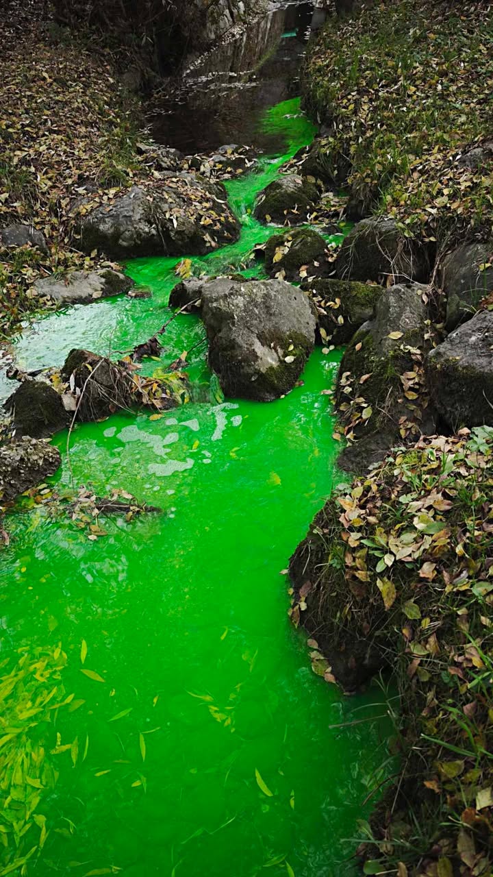 Nach ersten Untersuchungen handelt es sich bei der Flüssigkeit um Uranin – einen Farbstoff, der mit Wasser verdünnt zur Dichtheitsprüfung auf Flachdächern verwendet wird. Laut den Behörden ist der Stoff ungefährlich für Flora und Fauna und löst sich unter Sonneneinstrahlung nach einigen Stunden wieder auf.