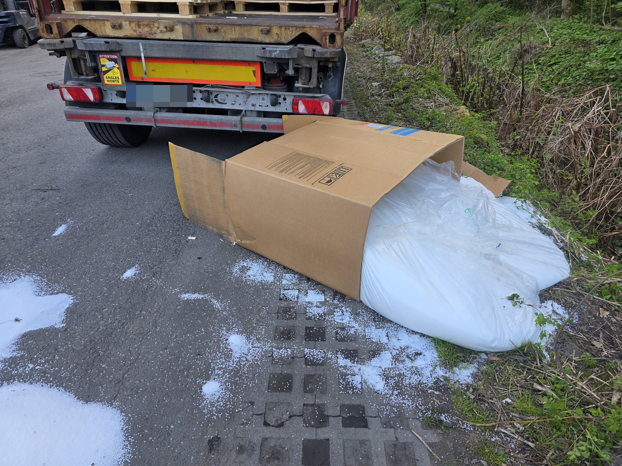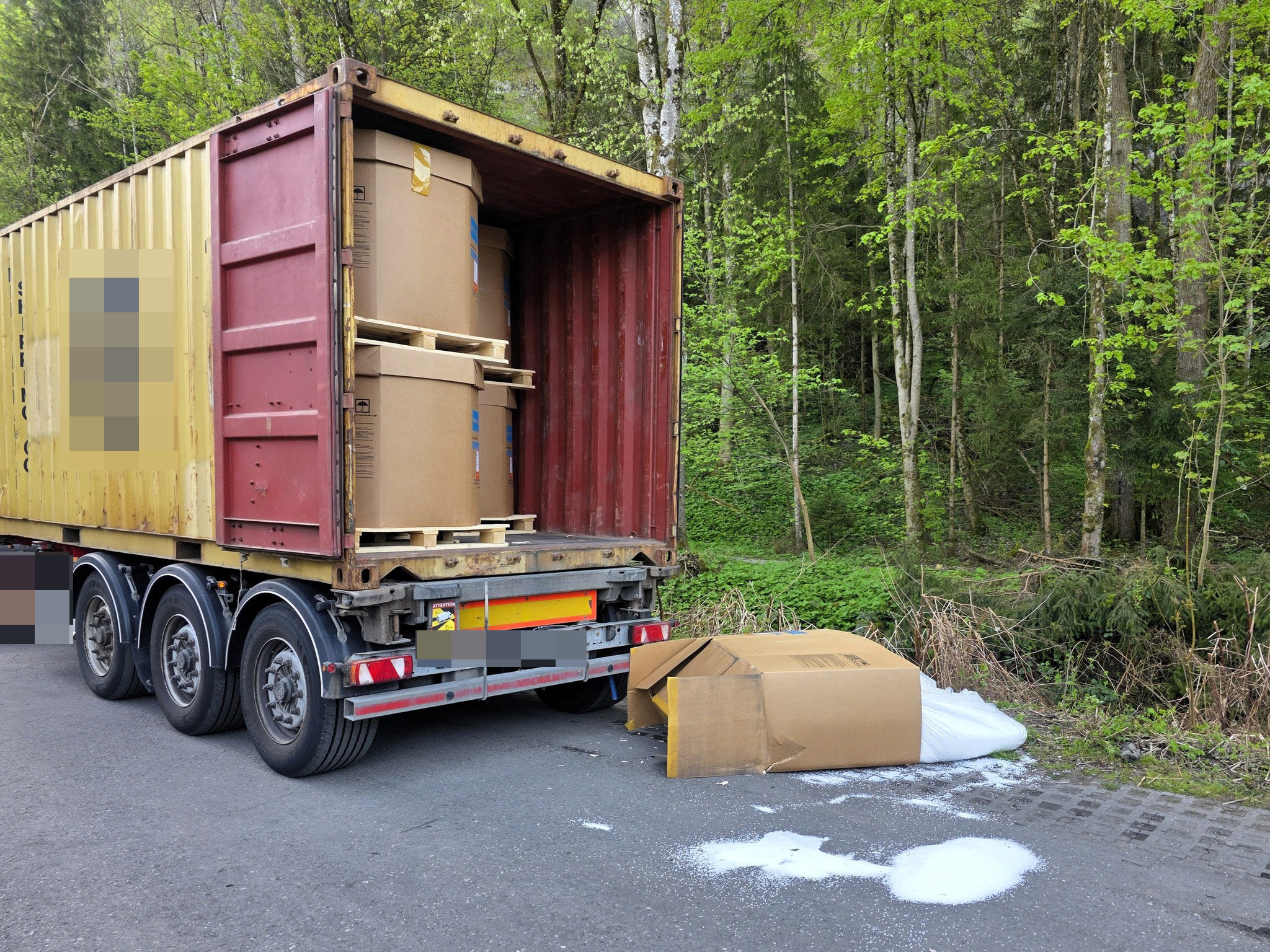 Gegen 09:30 Uhr lud ein Arbeiter bei einem Hohenemser Transportunternehmen 900 Kilogramm schwere Behälter mit Plastikgranulat ab. Eines dieser Behältnisse rutschte von der Palette und fiel auf den Boden. Dabei trat der Inhalt aus und ein Teil gelangte in den angrenzenden Haselwurzbach.