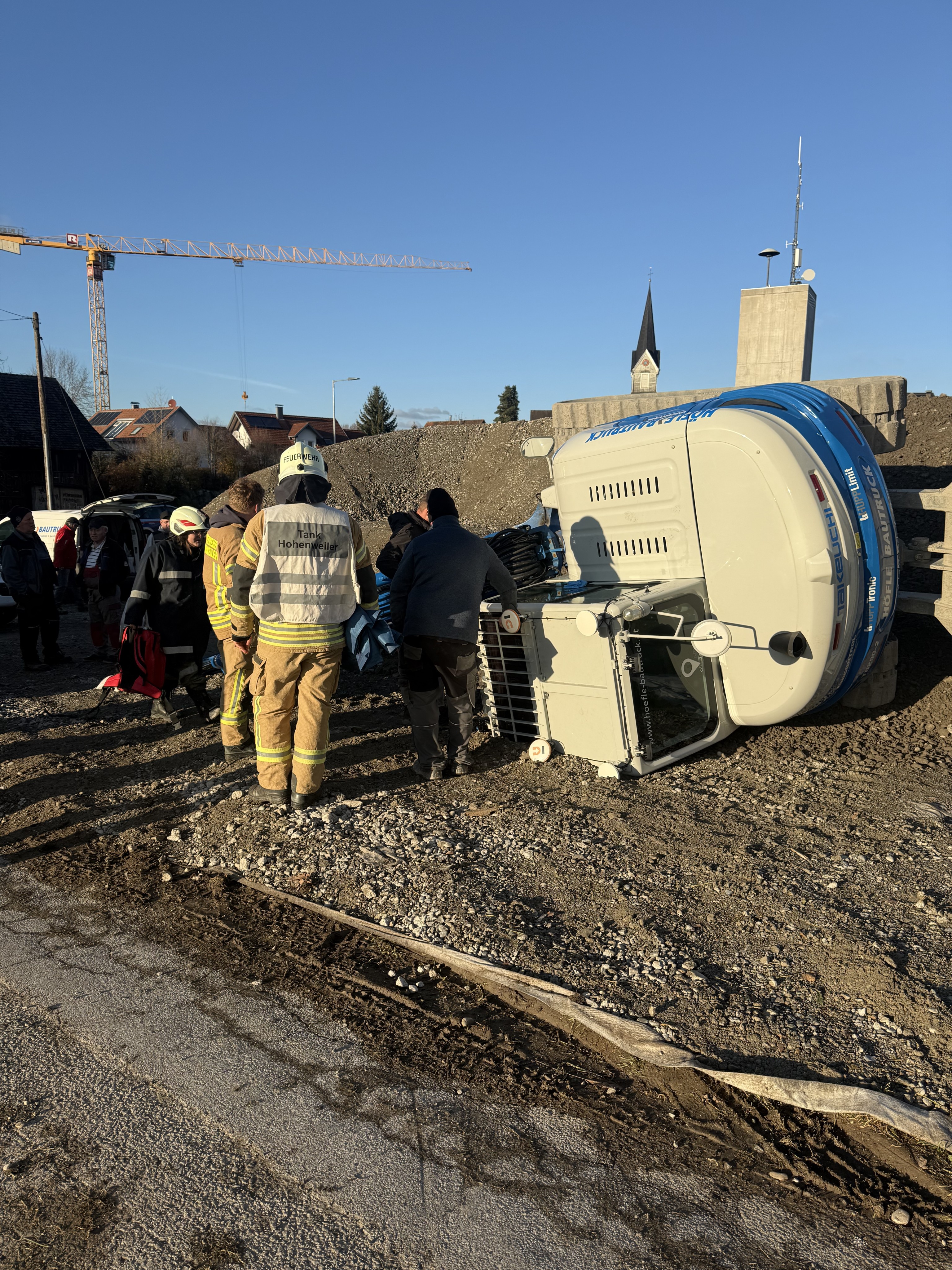 Der Baggerfahrer kippte mit seinem Fahrzeug aus bislang unbekannter Ursache um. Er war kurzzeitig bewusstlos und wurde unbestimmten Grades verletzt.