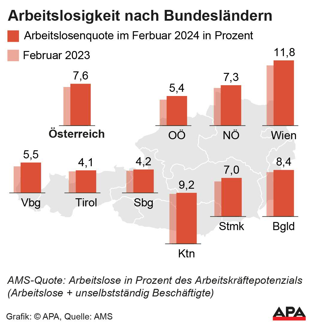 Ende Februar 2024 waren 402.297 Personen (7,6 Prozent) beim Arbeitsmarktservice (AMS) in ganz Österreich als arbeitslos gemeldet oder befanden sich in Schulungsmaßnahmen. Von diesen waren 321.655 Personen offiziell arbeitslos und 80.642 nahmen an vom AMS angebotenen Schulungsmaßnahmen teil.