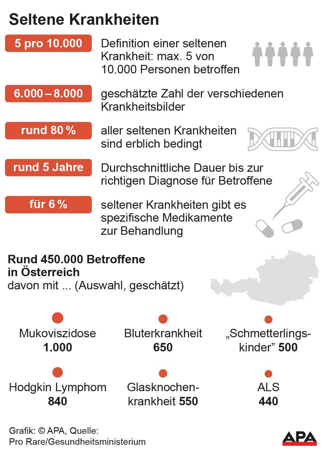 Die Diagnose ist schwierig und langwierig, die Behandlungsmöglichkeiten sind überschaubar und die Entwicklung von entsprechenden Medikamenten teuer. Seltene Krankheiten betreffen rund 450.000 Personen in Österreich, ein großer Teil davon Kinder und Jugendliche. Nur rund sechs Prozent gelten als spezifisch medikamentös behandelbar. Der Forschungsbedarf ist enorm, erklärten Expertinnen und Experten gegenüber der APA.