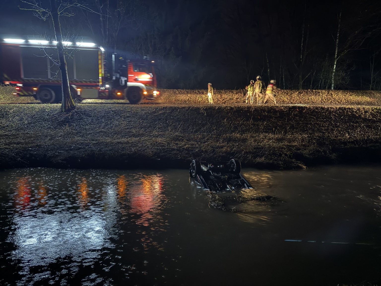 „Ein Reh lief plötzlich über den Weg, wir wichen aus, das Auto geriet ins Schleudern, rutschte die Uferböschung hinunter – und dann ins Wasser.“ Der Pkw kippte und kam auf dem Dach liegend zum Stillstand.