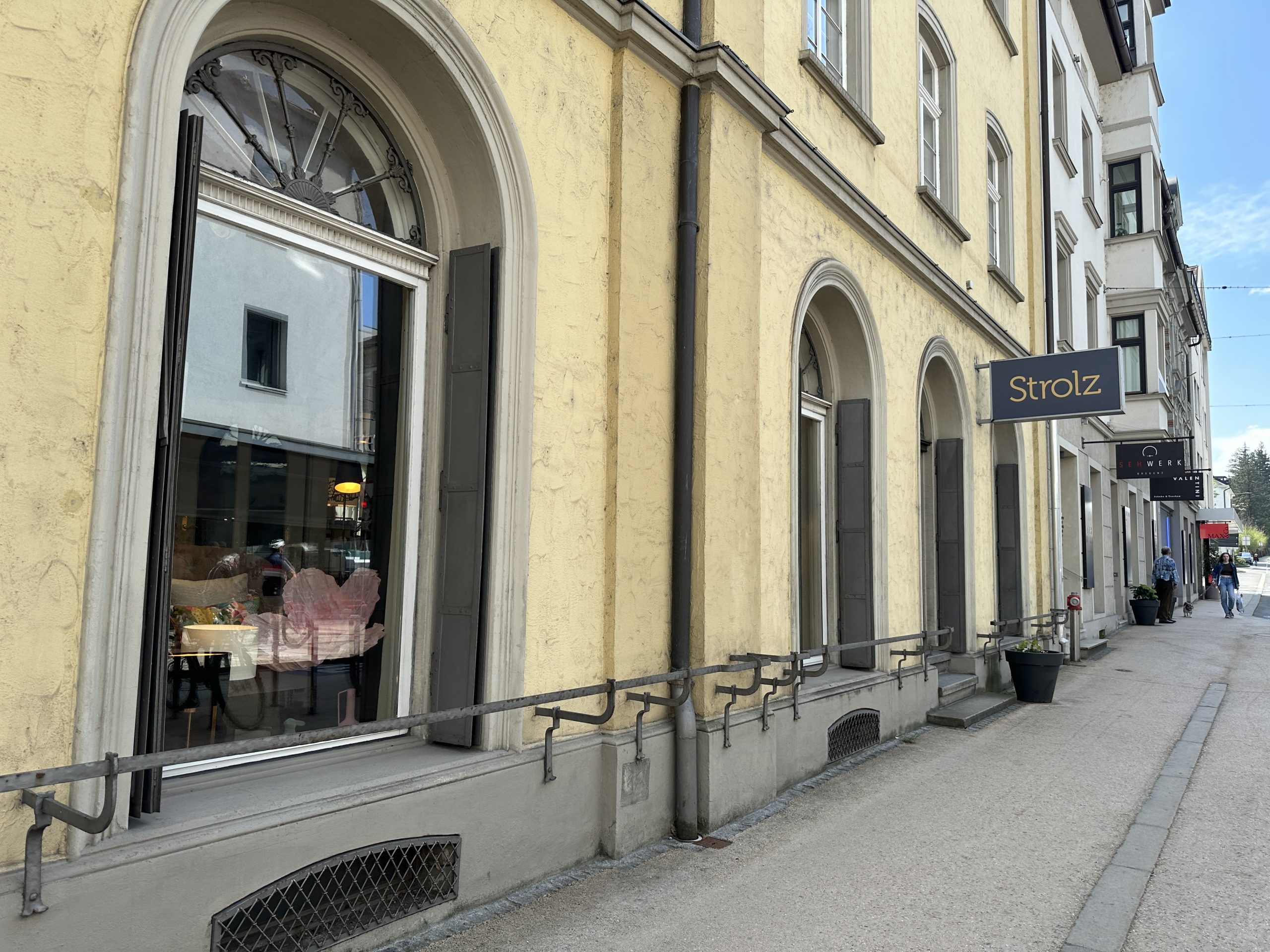 Auf der Suche nach einem geeigneten neuen Geschäft überlegte Strolz auch, in den Bregenzerwald zurückzukehren, wo nach wie vor in Schwarzenberg produziert wird. Eher zufällig kam sie zum neuen Geschäftslokal in der Marktstraße. Dort schloss im Dezember 2023 "Tasche und Co." nach 14 Jahren. Die Lage neben dem Bregenzerwälder Juwelier Michael Rüscher und der Rösterei Kaffeebohne mit Café hat es Strolz angetan: "Das ergibt, glaube ich, eine ganz coole Ecke." Das Gebäude ist für sie zudem ein architektonischer Hingucker.