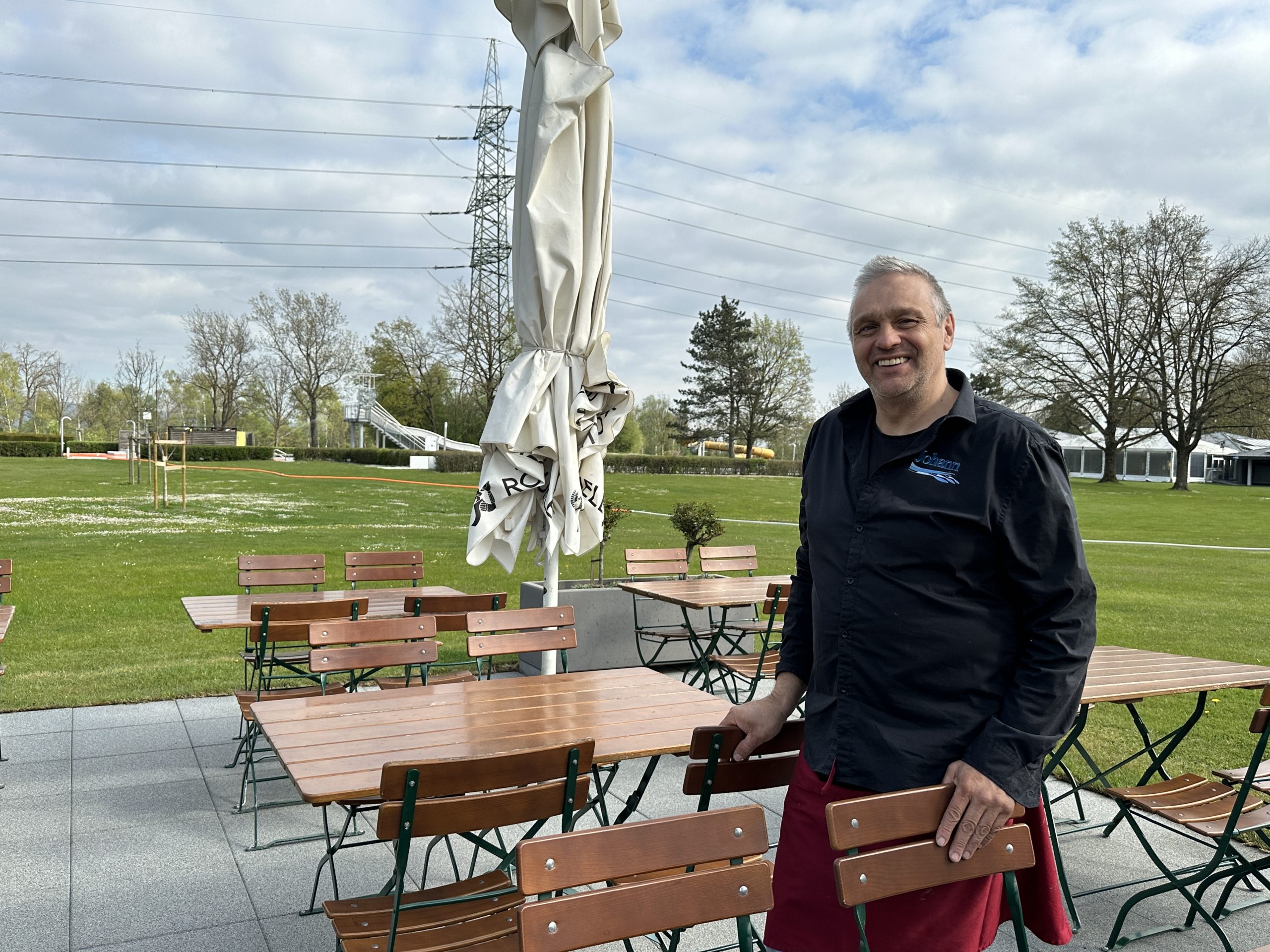 Schneeberger startete am vergangenen Wochenende mit dem Radlergarten in die Saison. Dieser ist im April von Freitag bis Sonntag von 11 bis 19 Uhr geöffnet – je nach Wetterlage. "Letztes Jahr schon habe ich ein bisschen hier gearbeitet, habe Mike geholfen", erzählt er. Als sich die Gelegenheit zur Übernahme bot, ergriff er sie. Der Betrieb im Radlergarten lief recht gut an: "Freitag, Samstag war schon ein bisschen was los, Sonntag eher weniger – aber es hat auch mittags schon geregnet." Im Schwimmbad selbst laufen aktuell noch die Saison-Vorbereitungen: beim VOL.AT-Besuch war ein Traktor auf den Liegewiesen unterwegs, auch im Gastro-Bereich rund um den Kiosk muss noch einiges erledigt werden.