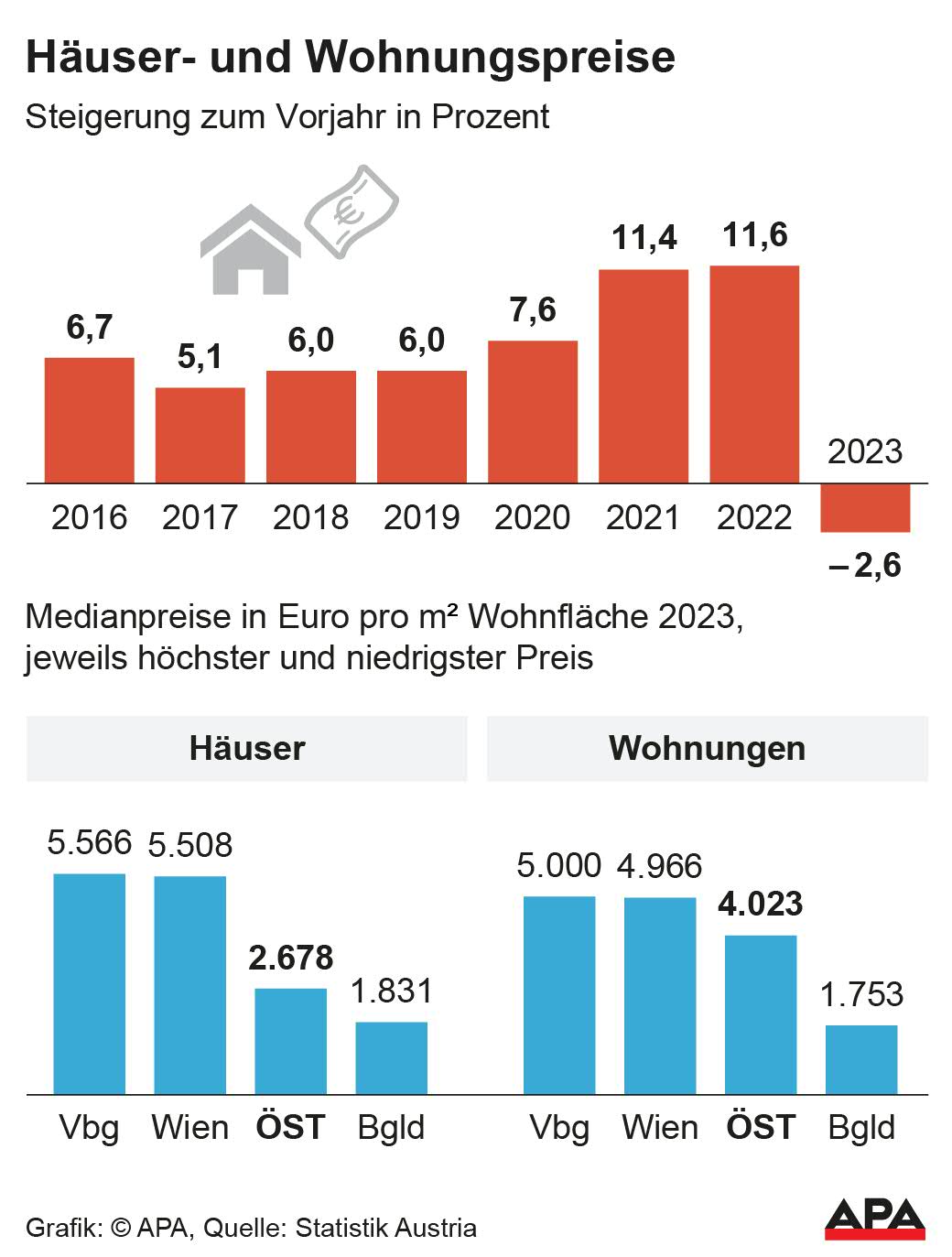 Der Preisrückgang folgte der Zinswende der Europäischen Zentralbank (EZB), die ab 2022 die Zinsen rasch anzog um der hohen Inflation Herr zu werden. Im Jahr 2022 waren die Preise für bestehende Häuser und Wohnungen im Jahresdurchschnitt noch um 11,6 Prozent angezogen, Preise für Neubauten um 11,5 Prozent. "Mit der Zinswende der EZB hat das ein jähes Ende genommen", sagte Statistik-Austria-Generaldirektor Tobias Thomas am Dienstag bei einer Pressekonferenz.