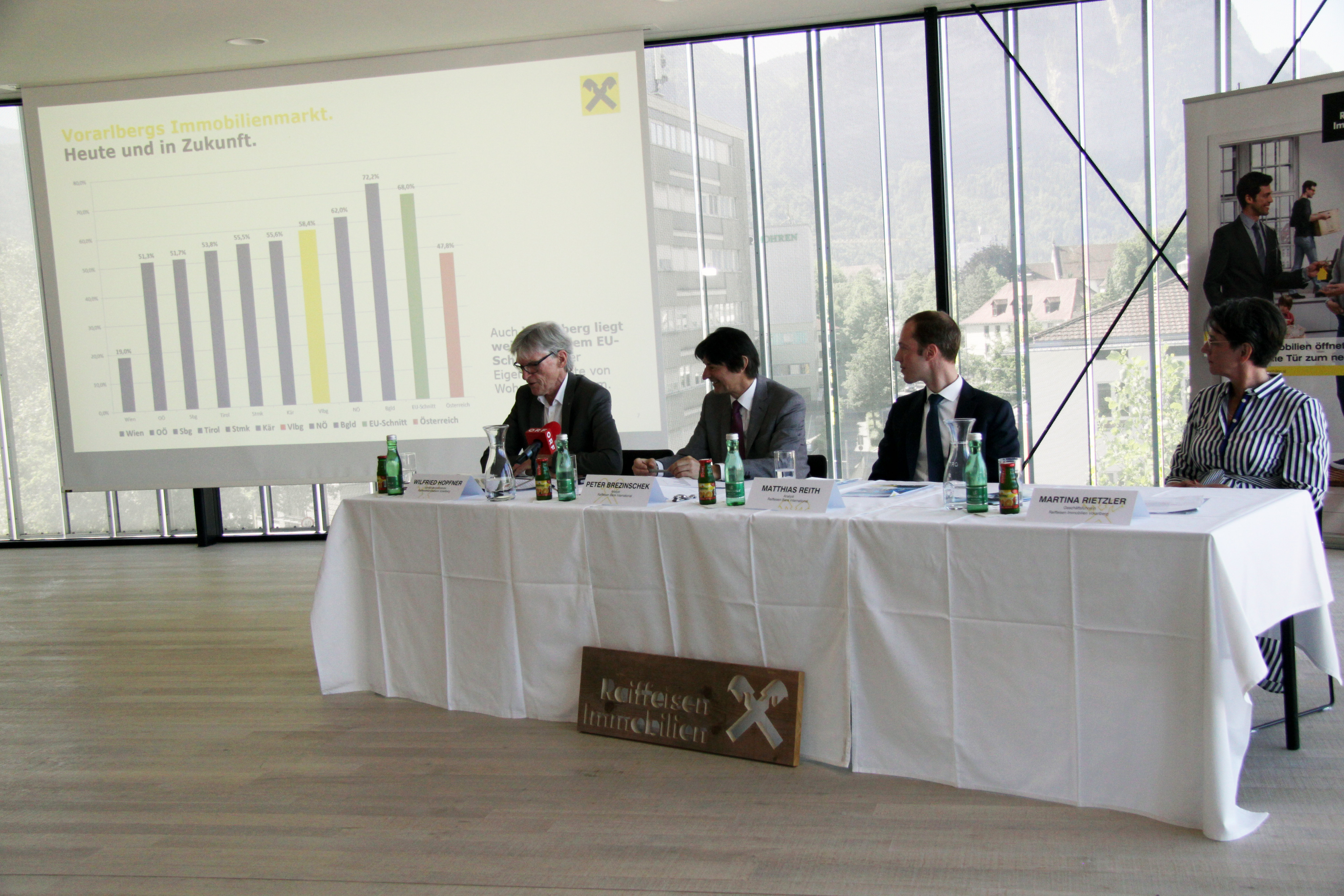 "Die hohen Preise im Westen kommen nicht von ungefähr", erläutert Raiffeisen Vorstand Wilfried Hopfner. "Vielmehr spiegeln sie die gute wirtschaftliche Lage, das überdurchschnittliche Einkommen und die dynamische Bevölkerungsentwicklung wider." Die hohen Kosten lassen die Eigentumsquote in Vorarlberg vergleichsweise niedrig ausfallen: Liegt der EU-Durchschnitt bei 68 Prozent, so sind es in Vorarlberg lediglich 58 Prozent – immerhin aber der dritthöchste Wert in Österreich.