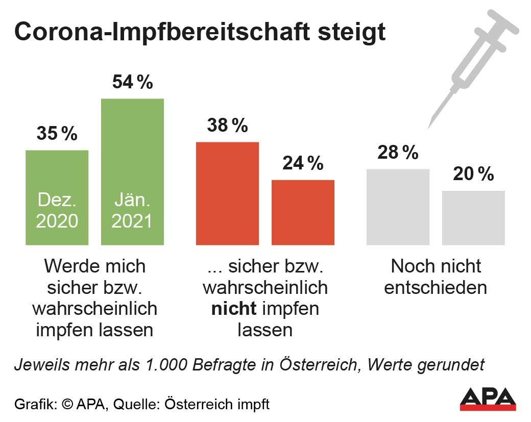 Die Impfbereitschaft gegen das Coronavirus in Österreich ist zuletzt merklich gestiegen. Während sich im Dezember noch 35 Prozent sicher oder wahrscheinlich impfen lassen wollten, waren es im Jänner 54 Prozent, berichtete die Initiative "Österreich impft" am Freitag bei einer Pressekonferenz. Unabhängig von der Umfrage wurde Skepsis gegenüber dem Impfstoff von AstraZeneca bemerkt. Alle zugelassenen Vakzine bieten einen hohen Schutz vor schweren Fällen, betonten die Mediziner.