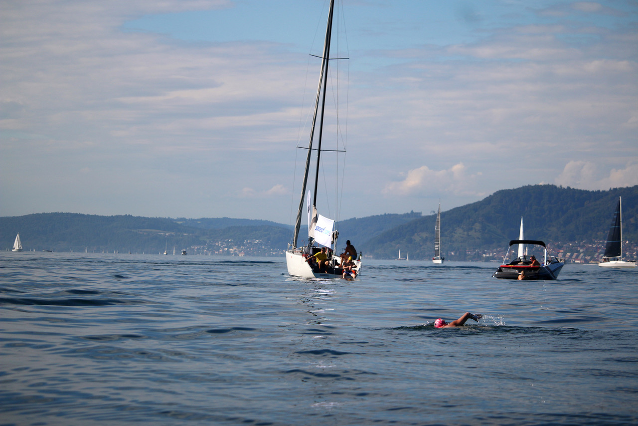 Martyn Webster sprang um 19.25 Uhr in Bregenz ins Wasser. Vor ihm lag mehr als nur eine Marathon-Distanz. Er schwamm jedenfalls zunächst dem Sonnenuntergang entgegen. "Die Nacht war wirklich gefühlt extrem lang", sagte er im Ziel. Durch den Nebel am Morgen waren vor allem die Begleiter gefragt, denn dadurch gab es sehr schwierige Strömungsverhältnisse. Für Martyn Webster war das weniger dramatisch. "Der Nebel war o.k.", sagte er. "Wenn ich schwimme orientiere ich mich am Beiboot – und das war immer da." Dass er allerdings auf der Strecke zwischen Immenstaad und Hagnau mehrere Stunden verloren hat, weil er kaum vorankam, fiel ihm gar nicht auf.