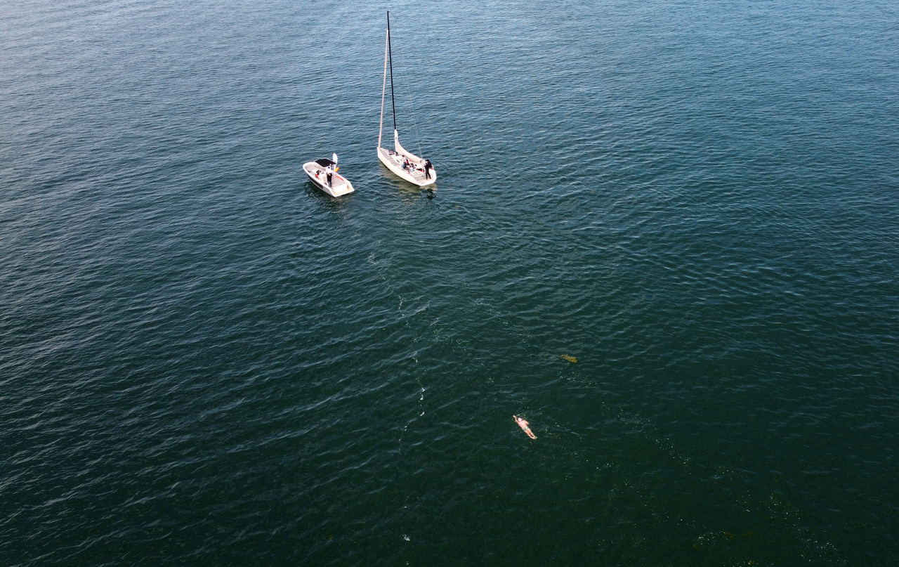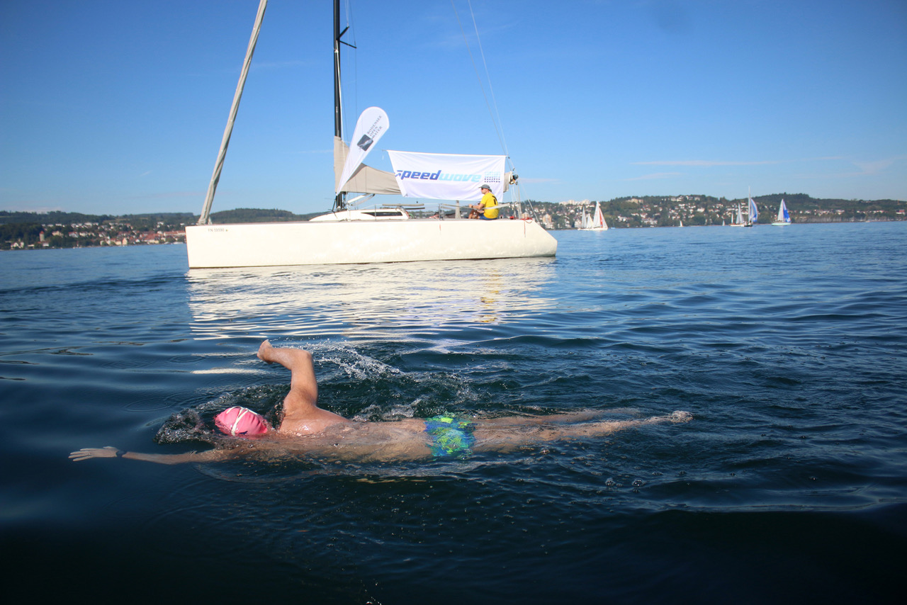 Sein Ziel: Er wollte den Bodensee längs durchqueren von Bregenz bis nach Bodman. Das sind 64 Kilometer. Bislang haben erst drei Menschen diese Strecke erfolgreich absolviert. Alle sind allerdings in Bodman gestartet. Von Bregenz aus gab es noch keinen erfolgreichen Starter. Auch für Patrick Boche von Bodensee Open Water, der die Begleitung von Martyn Webster organisierte, war es eine Premiere. Bislang veranstaltete er die Bodenseequerungen von Wallhausen nach Überlingen (2,5 km), von Meersburg nach Konstanz (5 km) und von Friedrichshafen nach Romanshorn (12 km). Längs durch den Bodensee hat aber auch er bislang noch keinen Schwimmer begleitet.