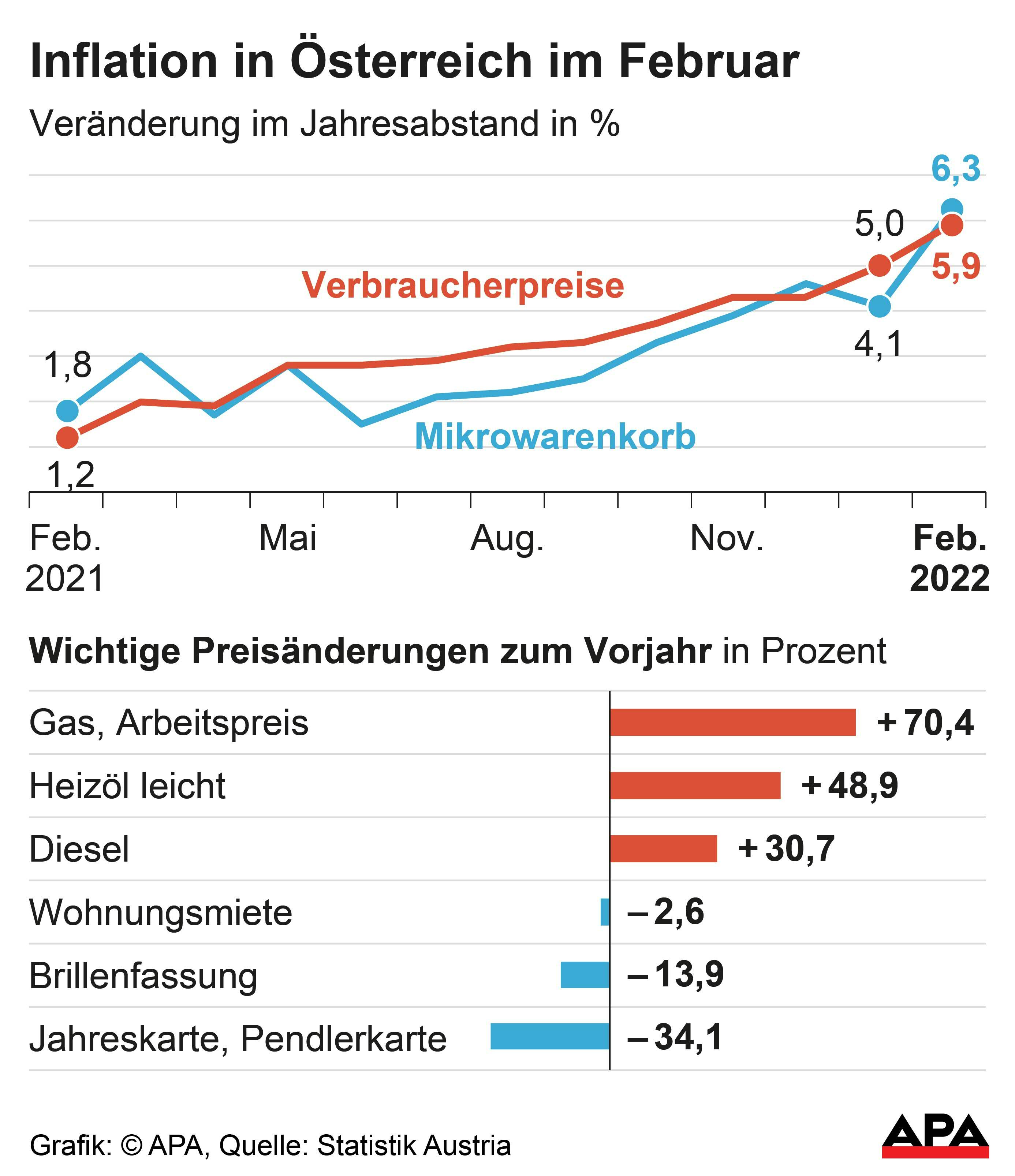 Die Preisspirale hat sich damit weiter nach oben gedreht, im Jänner lag die Inflation hierzulande noch bei 5 Prozent. Die für Eurozonen-Vergleiche ermittelte Harmonisierte Inflationsrate (HVPI) für Österreich betrug 5,5 Prozent. Der Unterschied beruht auf Gewichtungsunterschieden zwischen Verbraucherpreisindex (VPI) und HVPI. Die Teuerung ist gerade in ganz Europa hoch und liegt deutlich über den von der EZB angestrebten 2 Prozent.
