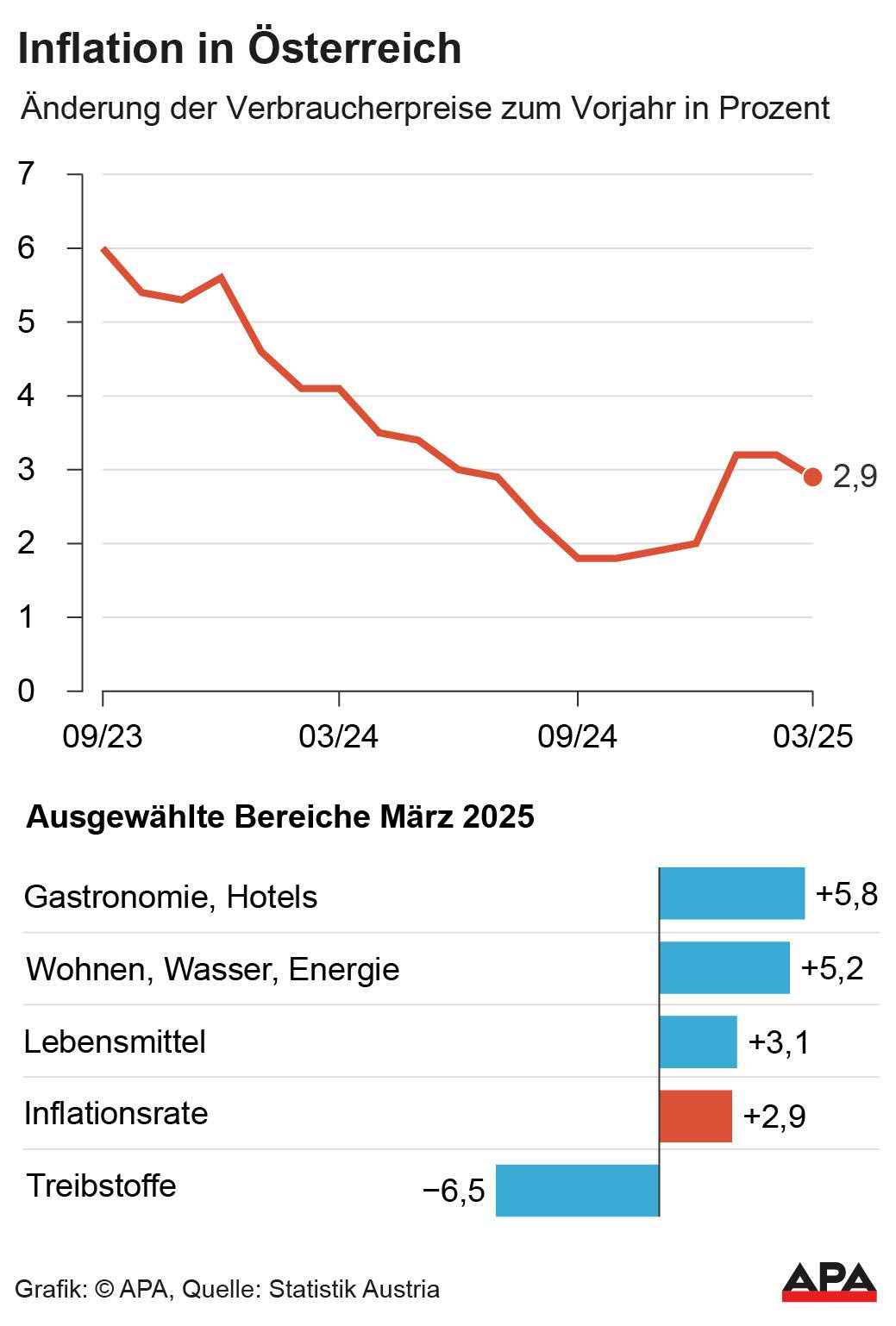 Mit den 2,9 Prozent Inflation (VPI) sieht Statistik-Austria-Chef Tobias Thomas einen Annäherungsschritt in Richtung des 2,0-prozentigen Inflationsziels der Europäischen Zentralbank (EZB). Von Februar auf März stieg das Preisniveau (nach Verbraucherpreisindex, VPI) laut der Behörde durchschnittlich um 0,2 Prozent.