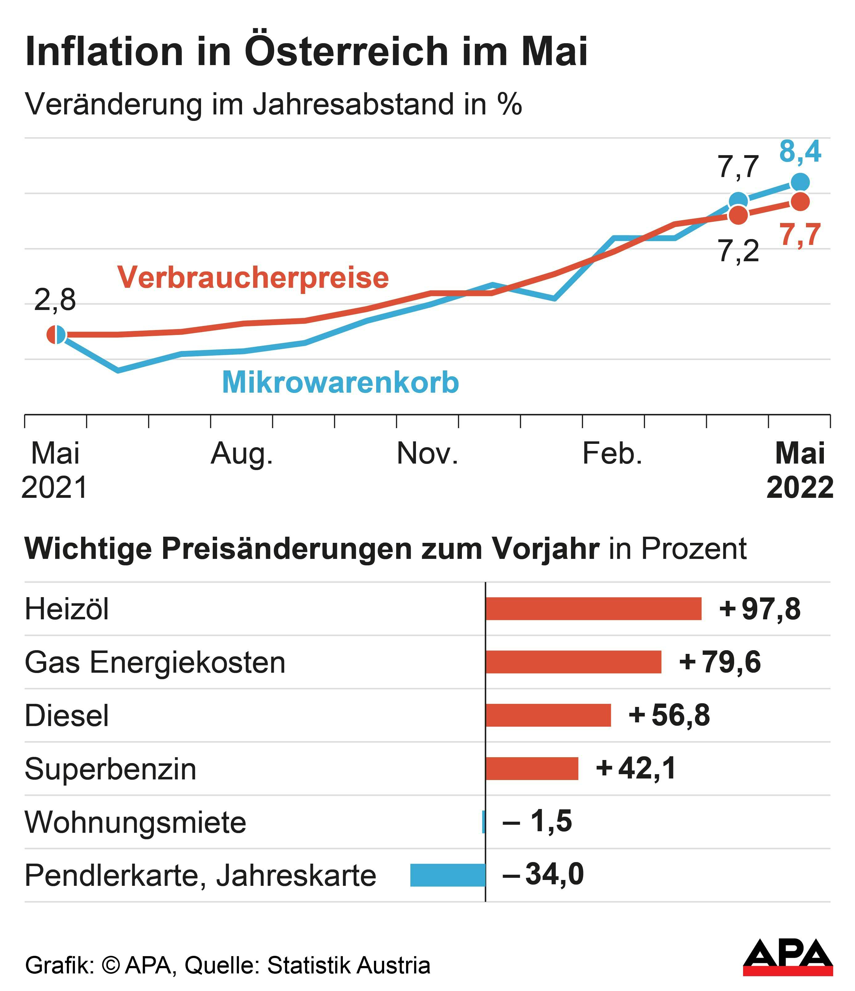Die Teuerung in Österreich hat sich weiter beschleunigt. Im Mai lag die Inflationsrate laut Statistik Austria bei 7,7 Prozent - nach 7,2 Prozent im April.Gegenüber dem Vormonat stieg das durchschnittliche Preisniveau um 0,8 Prozent.