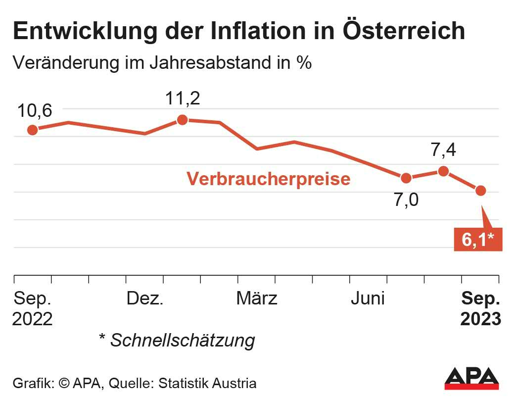 Die Jahresinflation (VPI) in Österreich dürfte im September auf 6,1 Prozent gefallen sein, nach 7,4 Prozent im August. Das geht aus der am Freitag veröffentlichten Schnellschätzung der Statistik Austria hervor.