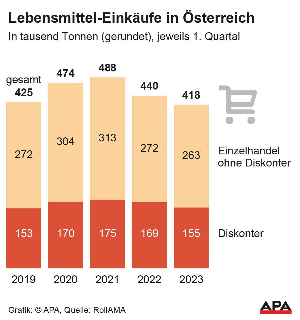 Die Einkaufsmenge lag in den ersten drei Monaten des Jahres um zwei Prozent unter den Werten von Anfang 2019, also vor der Coronakrise. Zugleich greifen die Konsumenten verstärkt zu Aktionswaren und gehen häufiger zum Diskonter, zeigen die RollAMA-Daten vom ersten Quartal 2023.