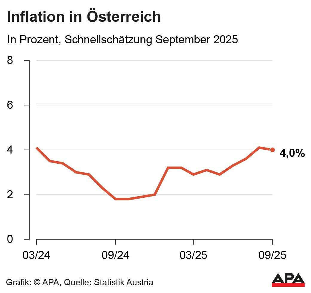 Inflation (CPI) in Austria remained at a high level of 4.0 percent in September. According to a quick estimate by Statistics Austria, the inflation rate decreased only slightly from 4.1 percent in August. The strongest price driver was again the service sector, with a price increase of 4.7 percent. Prices in Austria have been rising more sharply than in the Eurozone for some time, for which the ECB aims for an inflation rate of just under 2.0 percent.