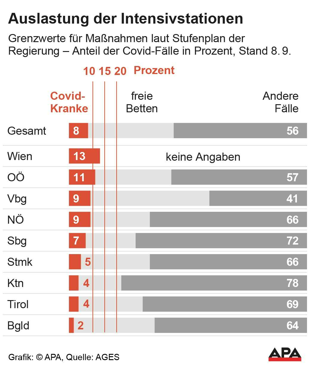 Österreichweit betrug die Auslastung nach den jüngsten AGES-Zahlen vom Montag acht Prozent, in Wien waren bereits 13 Prozent der Intensivbetten mit Covid-19-Patienten belegt, in Vorarlberg und Oberösterreich jeweils zehn und in Niederösterreich neun Prozent. Stufe 1 soll ab zehn Prozent bzw. 200 ICU-Betten in Kraft treten.