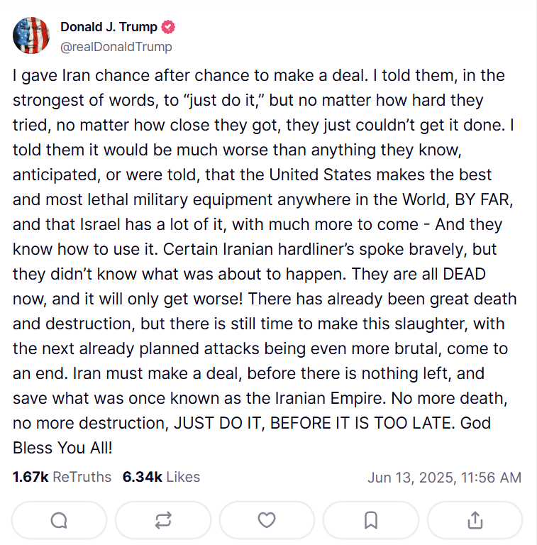 "Es hat bereits viel Tod und große Zerstörung gegeben, aber es ist noch Zeit, dieses Gemetzel zu beenden, wobei die nächsten Angriffe noch brutaler sein werden und bereits geplant sind", schrieb Trump am Freitag auf seinem Portal Truth Social. Israel hatte seine jüngsten Angriffe auf den Iran damit begründet, dass Teheran dringend am Bau von Atombomben gehindert werden müsse.