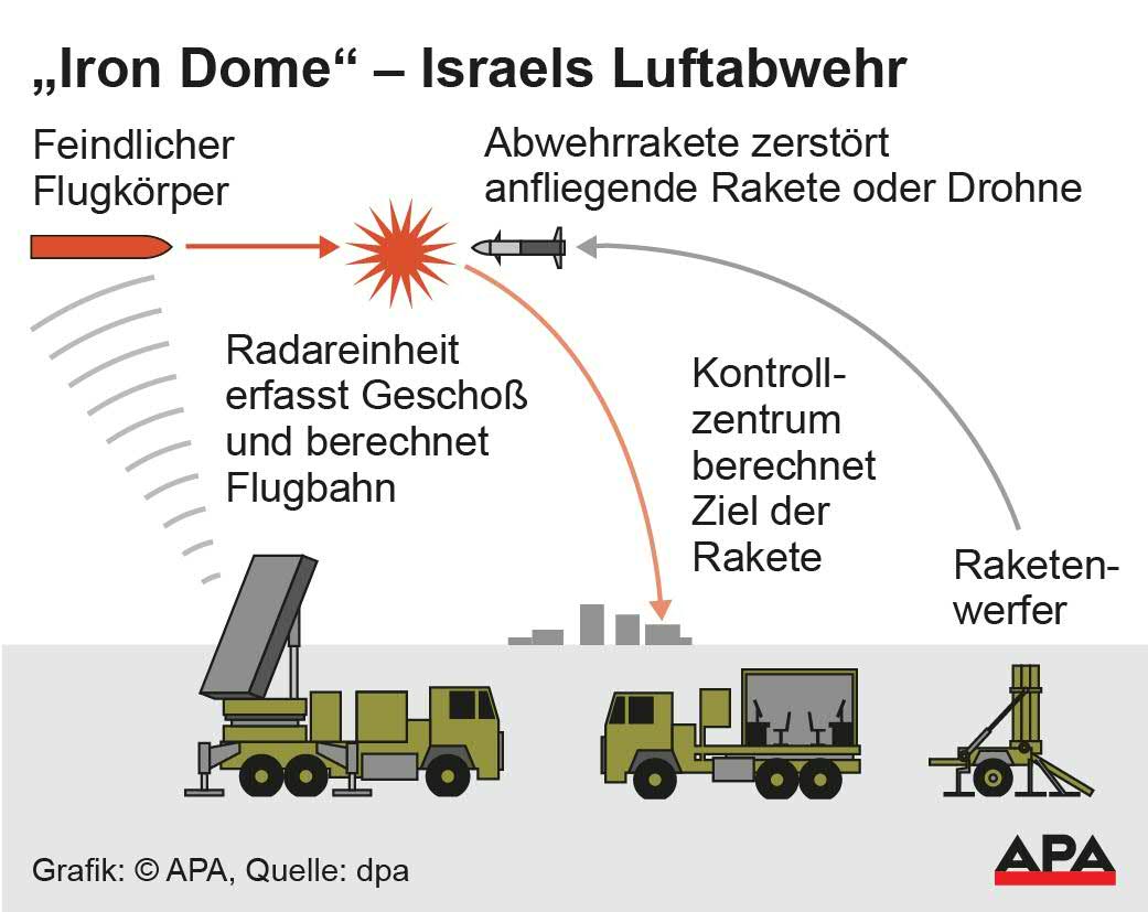 Der von Israel entwickelte Iron Dome (Eisenkuppel) fungiert in der Nähe. Das Abwehrsystem ist darauf spezialisiert, Raketen und Geschosse über kurze Distanz abzufangen. Eine Batterie kann ein kreisrundes Gebiet mit einem Radius von etwa sieben Kilometern beschützen. Die Fläche entspricht etwa einer Stadt wie Freiburg. Bau, Entwicklung und Instandhaltung haben die USA bisher mit mehr als drei Milliarden Dollar unterstützt - der Iron Dome gilt daher als Symbol für die Rolle der USA als Schutzmacht Israels.
