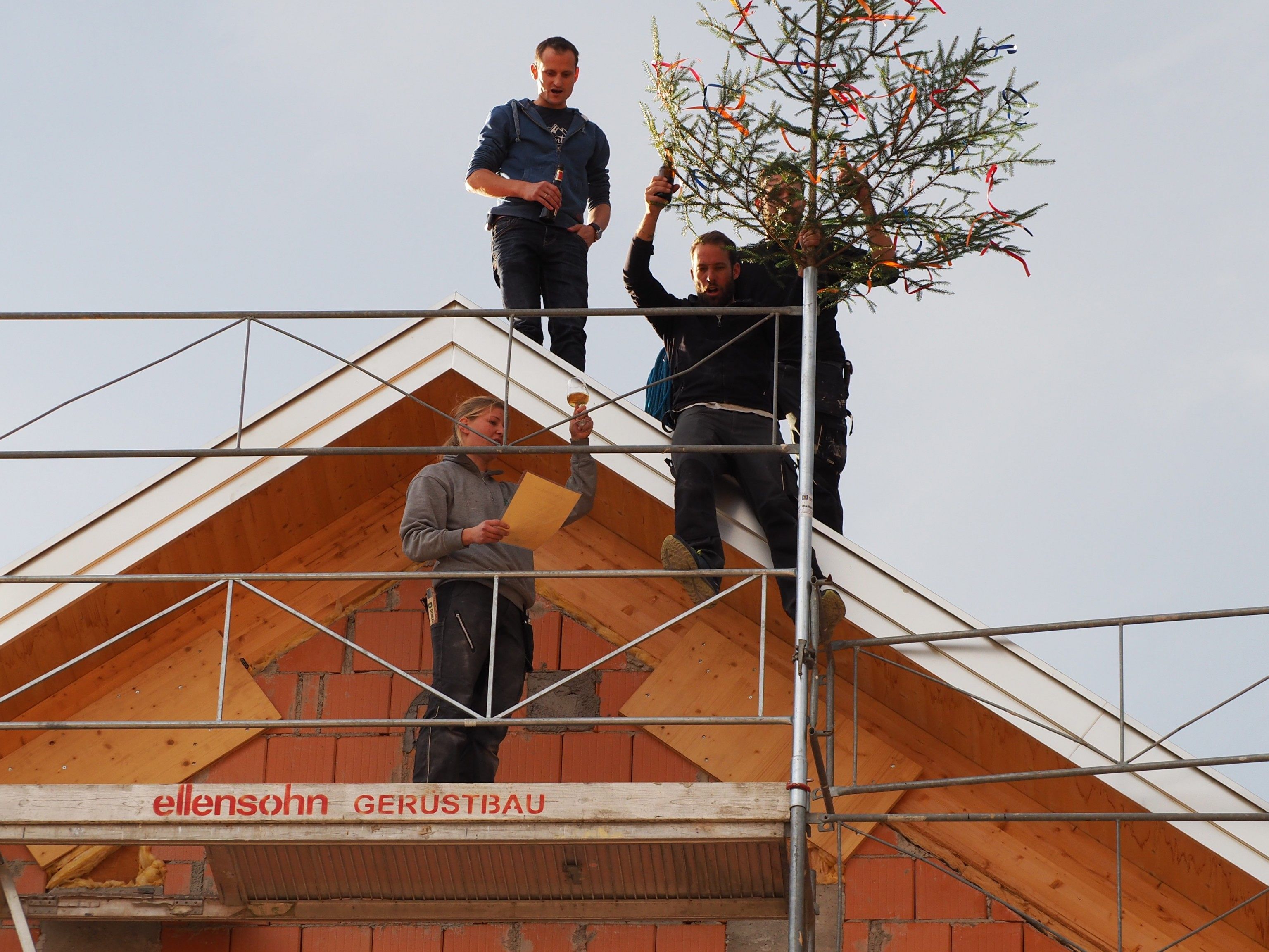 Bei den Feierlichkeiten, wo traditionell die zahlreichen beteiligten Handwerker im Mittelgrund stehen, begrüßte die stellvertretende Geschäftsführerin des Vorarlberger Kinderdorfs Anneli Kremmel-Bohle, in Vertretung von Christoph Hackspiel die Gäste („Heute ist ein Tag zum Feiern“), Wolfgang Ritter Projektleiter vom Generalplaner Kaufmann Architektur Dornbirn führte über die Baustelle. Landesstatthalter Karlheinz Rüdisser betonte die Aufgabe des Landes, jungen Menschen zu helfen, die es nötig haben: „Die Zielgruppen haben sich verändert, aber nicht die Aufgabe.“ Gefeiert wurde dann im Sinne des eingangs zitierten Richtspruchs: „Stolz und froh ist jeder heute, der emsig mit dem Werk gebaut, es waren fleißige Handwerksleute, die fest auf ihre Kunst vertraut.“ CEG