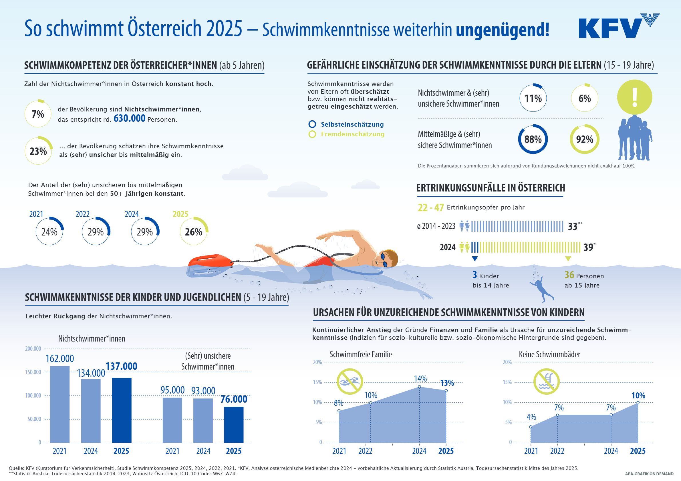 Eine aktuelle Studie des Kuratoriums für Verkehrssicherheit (KFV) zeigt alarmierende Entwicklungen bei den Schwimmkompetenzen junger Menschen in Österreich. Rund 137.000 Kinder und Jugendliche im Alter von 5 bis 19 Jahren können demnach nicht schwimmen. Besonders auffällig ist der Anstieg bei den 11- und 12-Jährigen: Während 2021 noch 5 Prozent dieser Altersgruppe zu den Nichtschwimmenden zählten, liegt der Anteil 2025 bereits bei 9 Prozent.