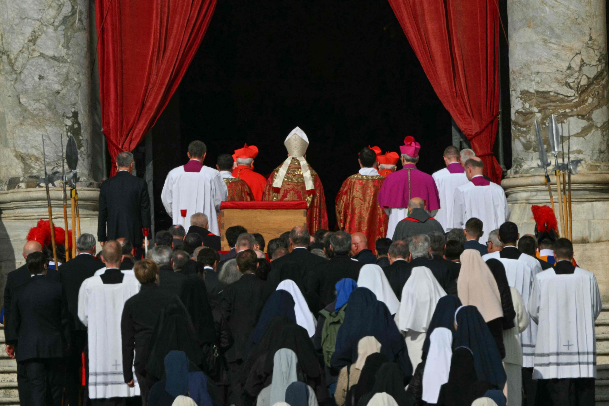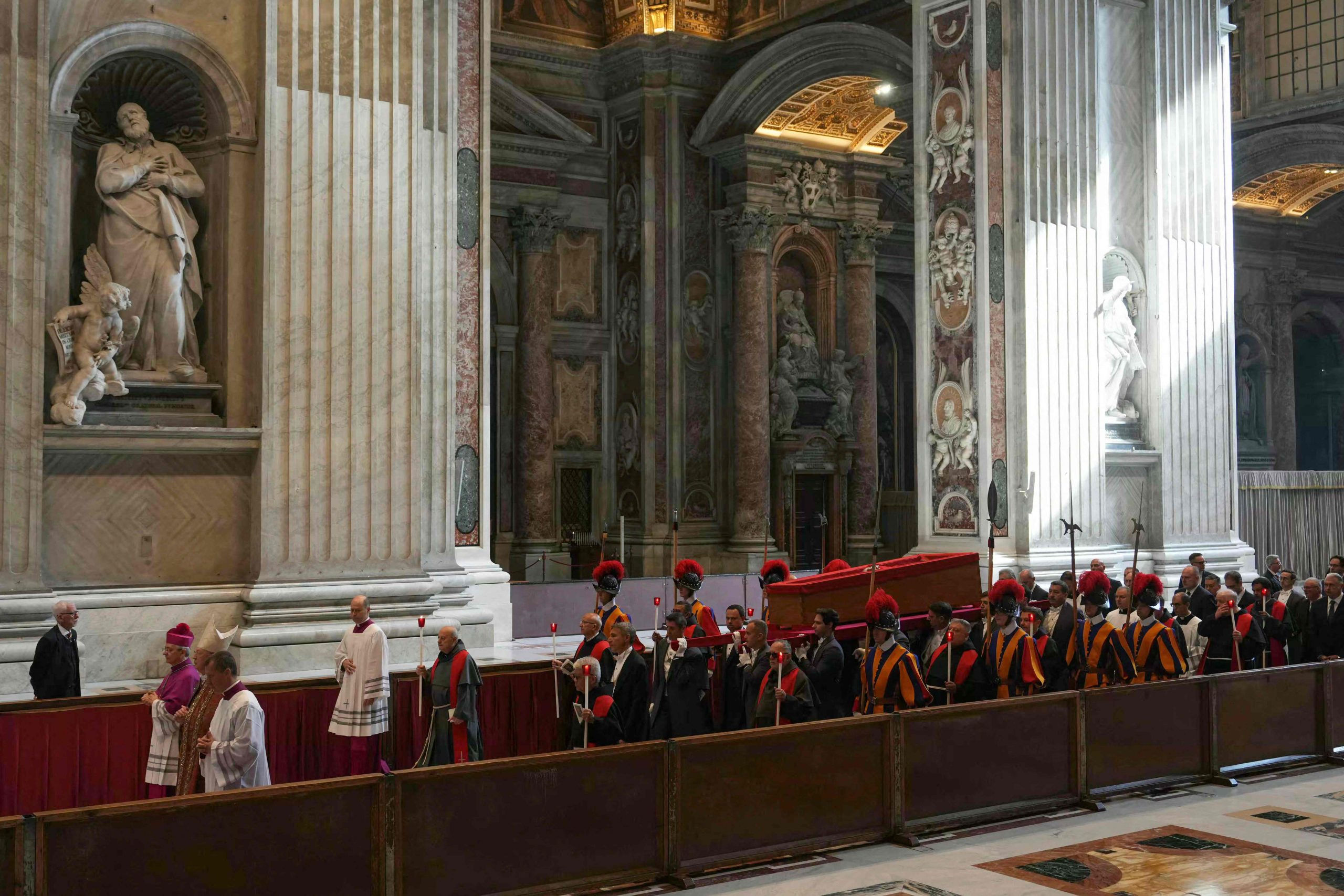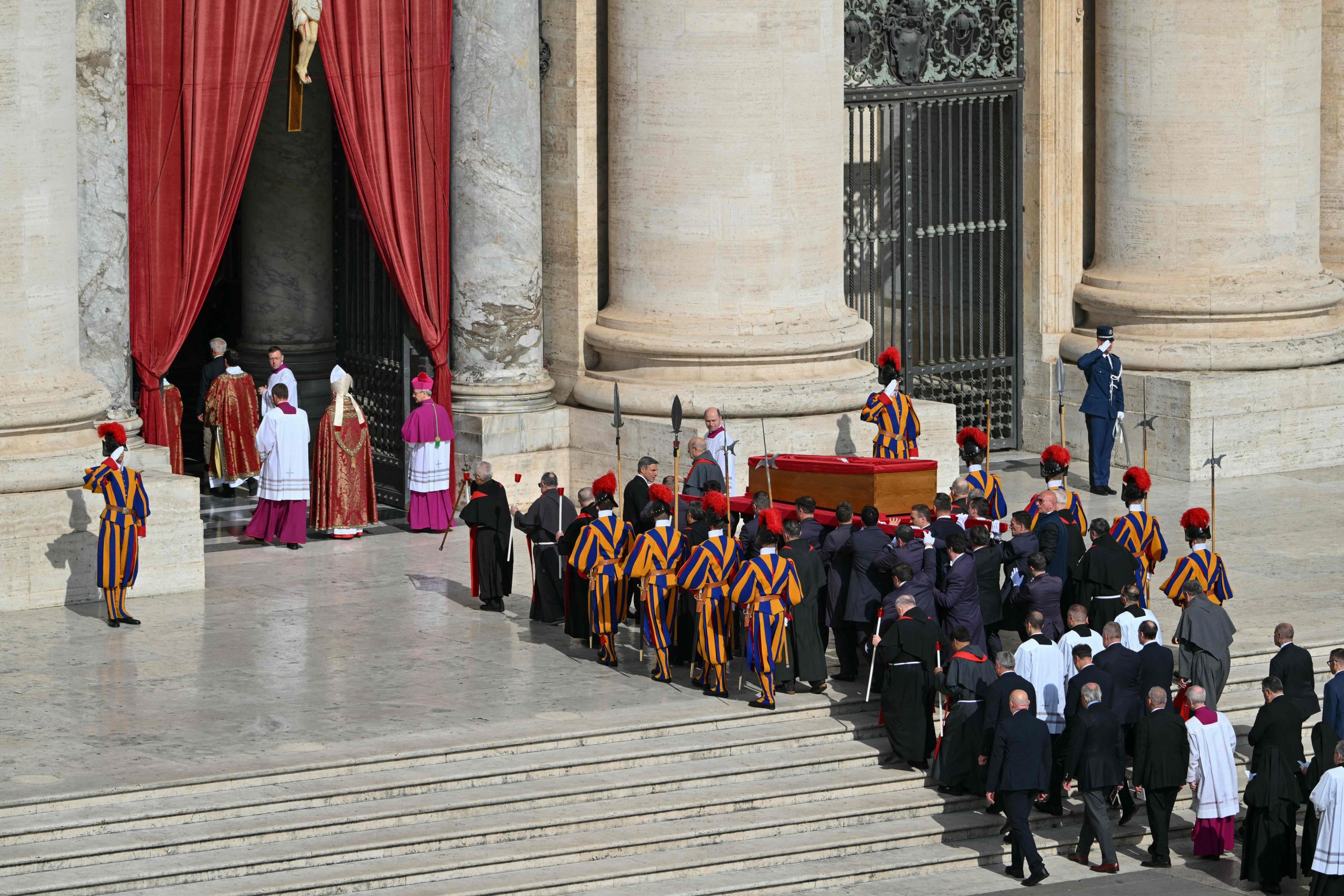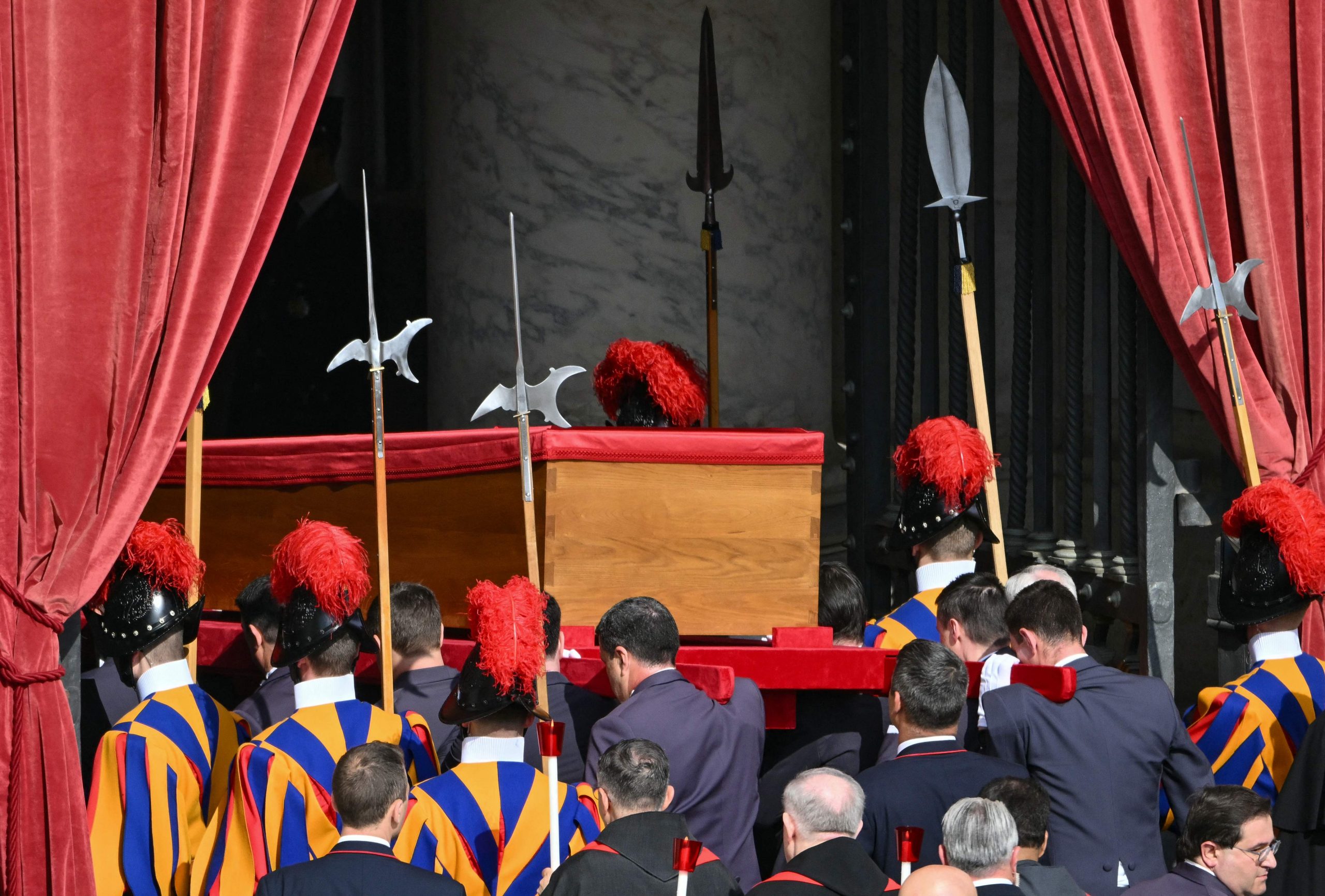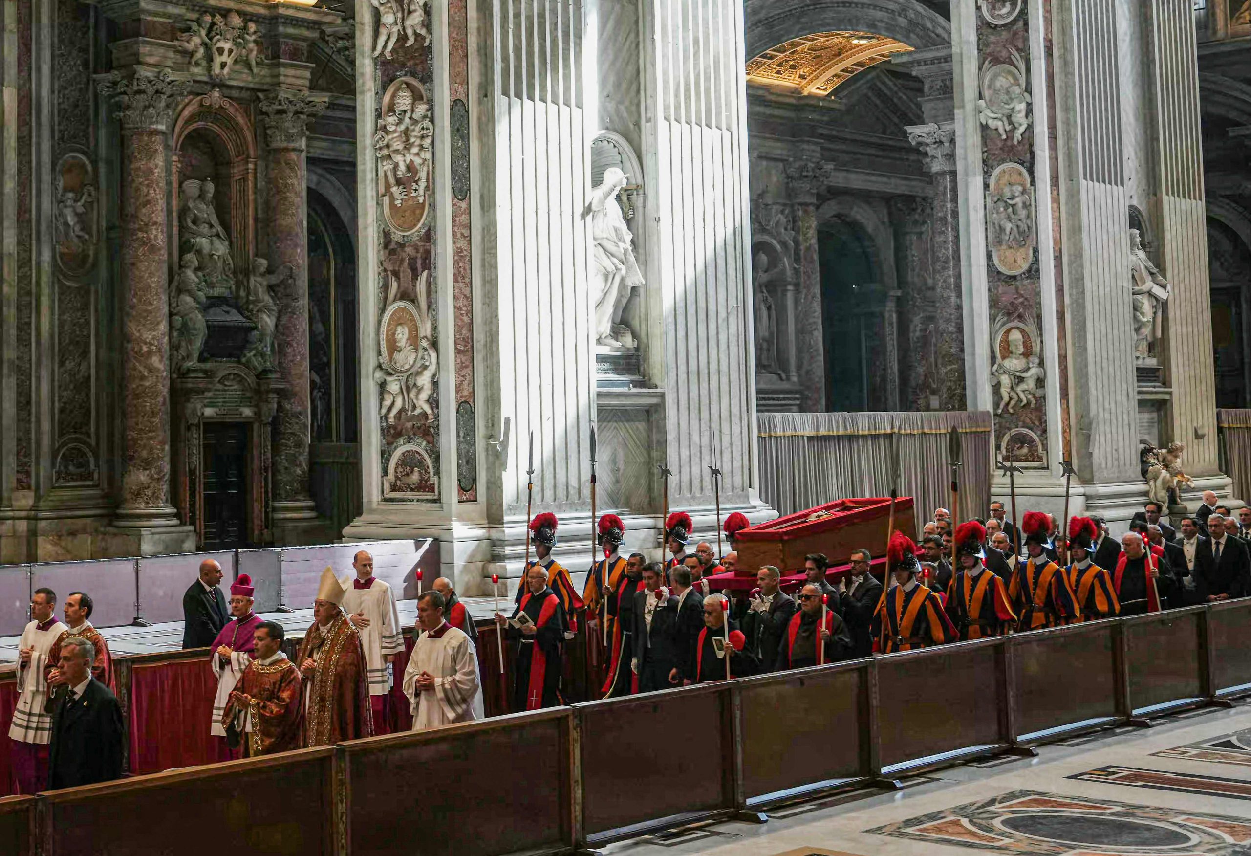Mittwochvormittag wurde der offene Sarg mit den sterblichen Überresten des Pontifex, begleitet von Dutzenden von Kardinälen und Schweizergardisten und untermalt vom Läuten der Totenglocke des Petersdoms, aus der päpstlichen Residenz Santa Marta zur Basilika getragen. Im Petersdom wird Franziskus bis Freitagabend aufgebahrt, Gläubige können dort von ihm Abschied nehmen.