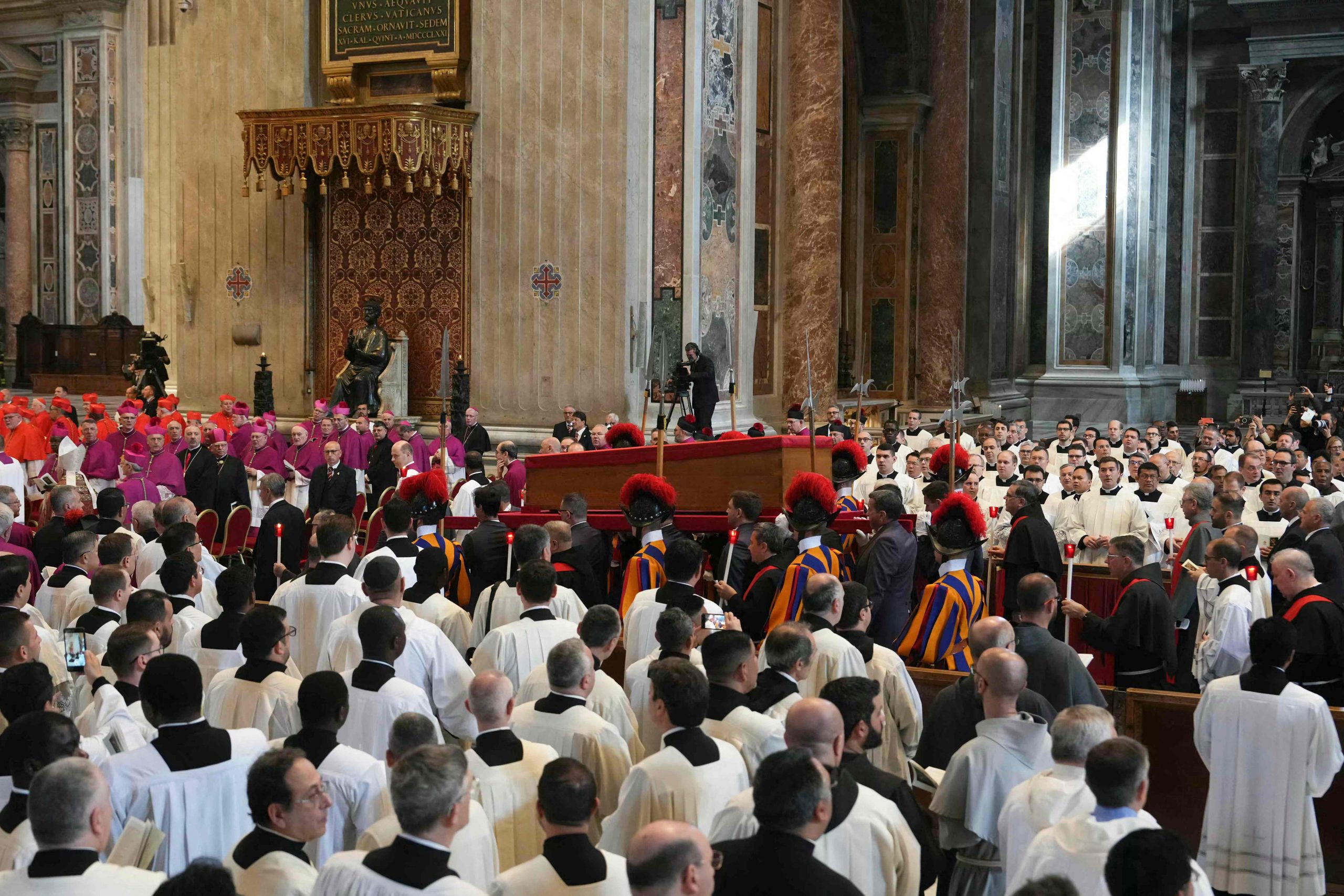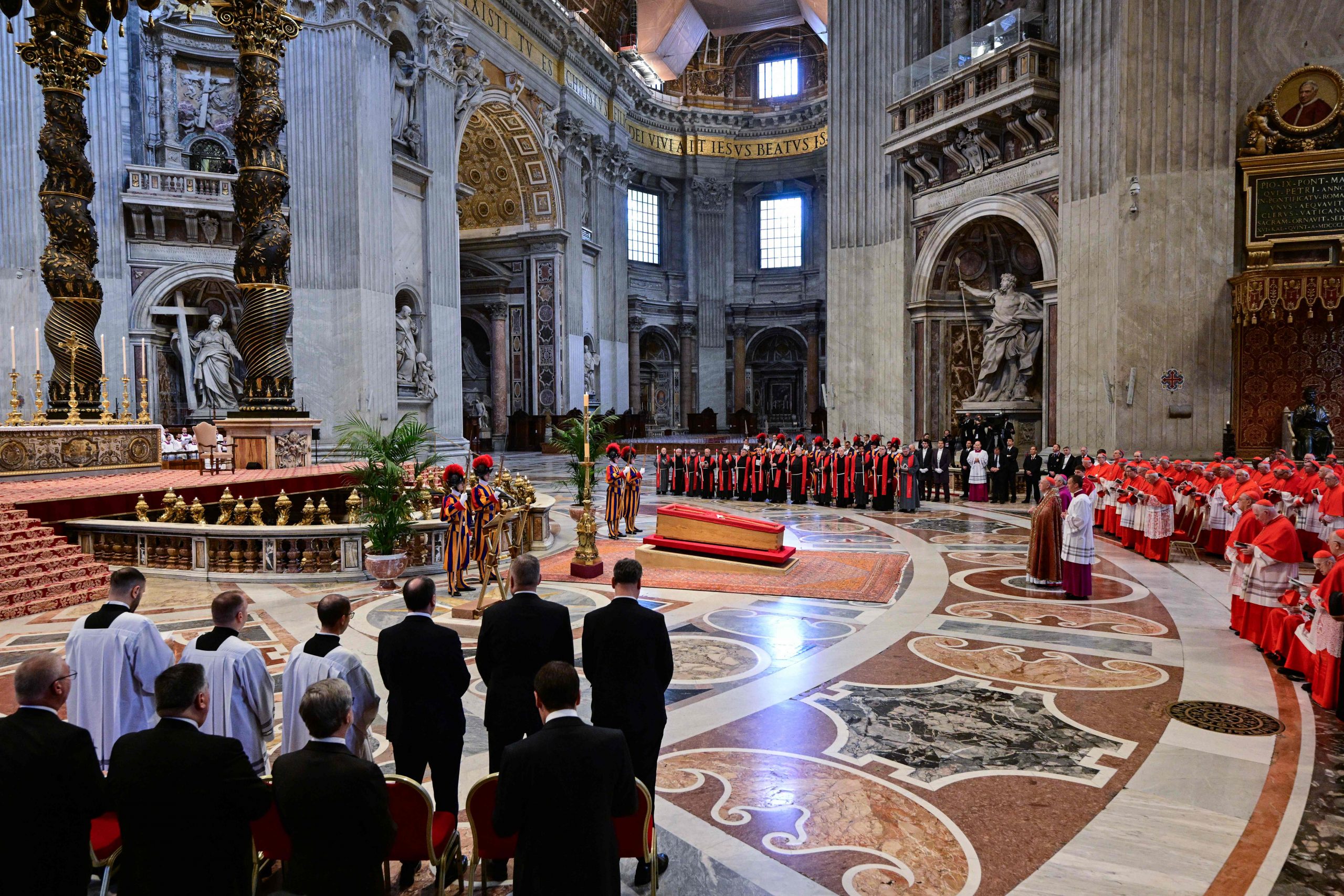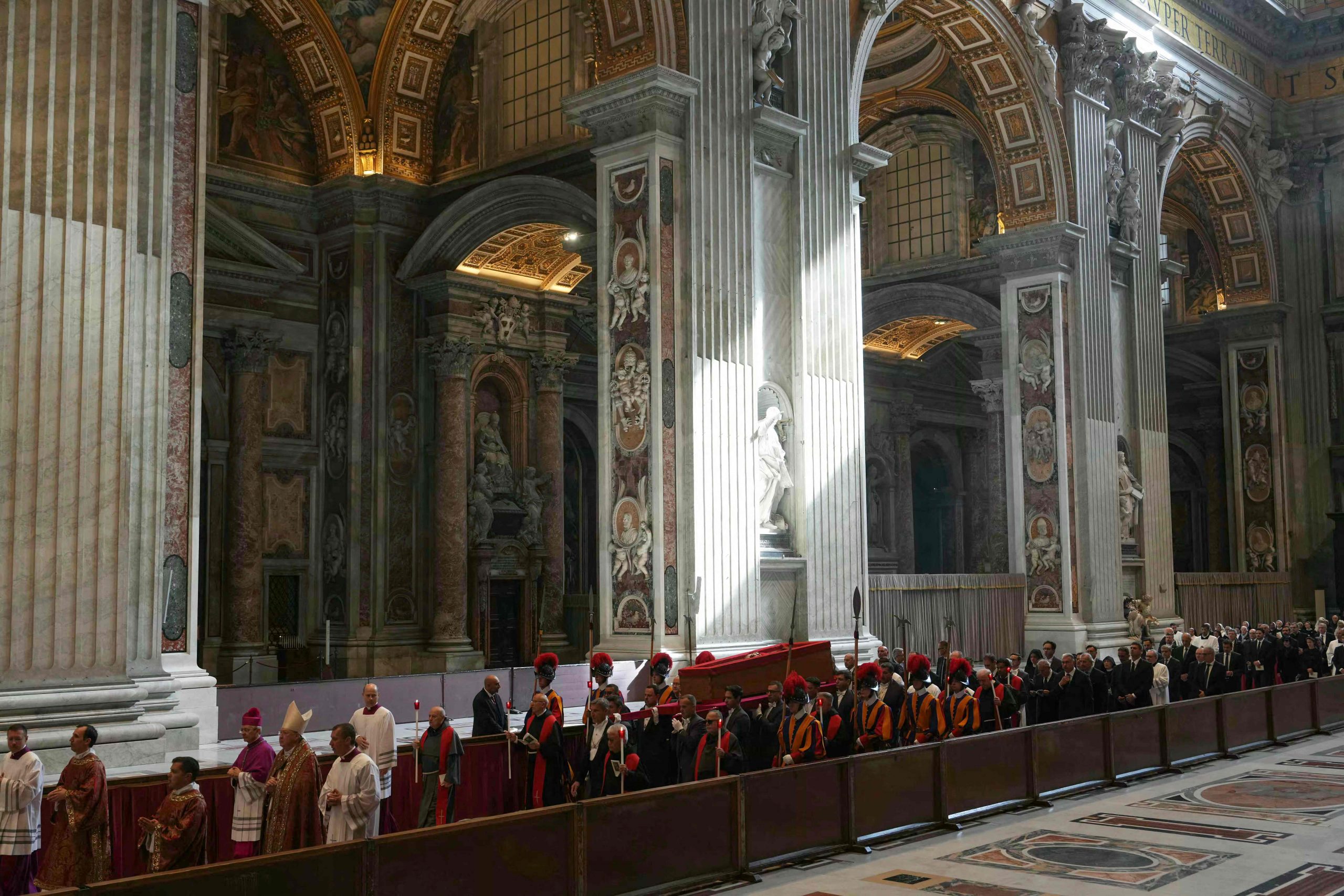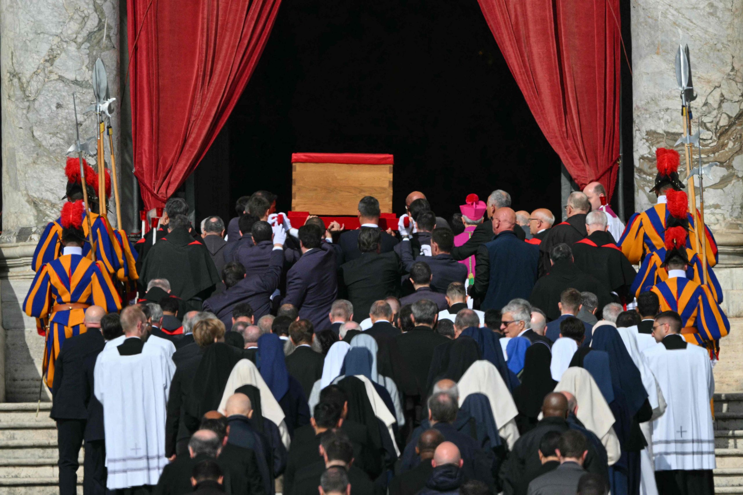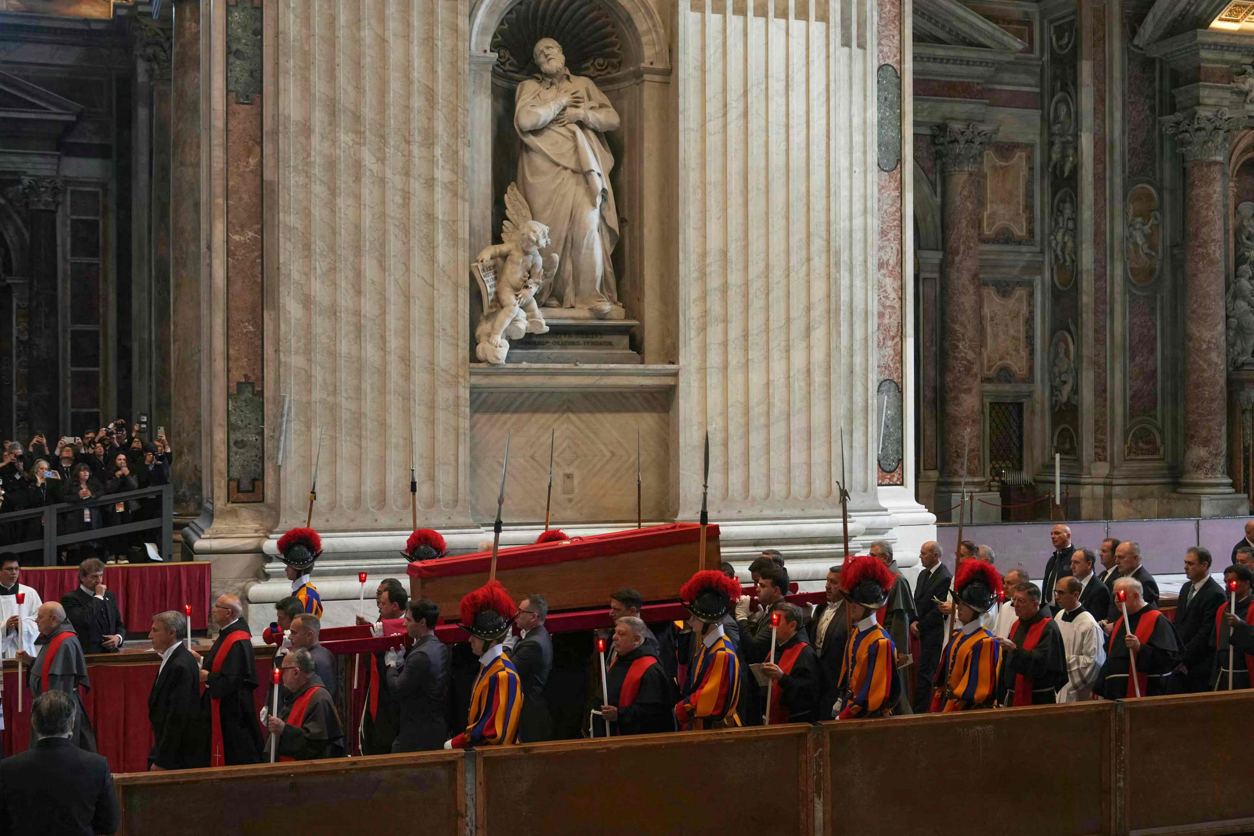 Mittwochvormittag wurde der offene Sarg mit den sterblichen Überresten des Pontifex, begleitet von Dutzenden von Kardinälen und Schweizergardisten und untermalt vom Läuten der Totenglocke des Petersdoms, aus der päpstlichen Residenz Santa Marta zur Basilika getragen. Im Petersdom wird Franziskus bis Freitagabend aufgebahrt, Gläubige können dort von ihm Abschied nehmen.