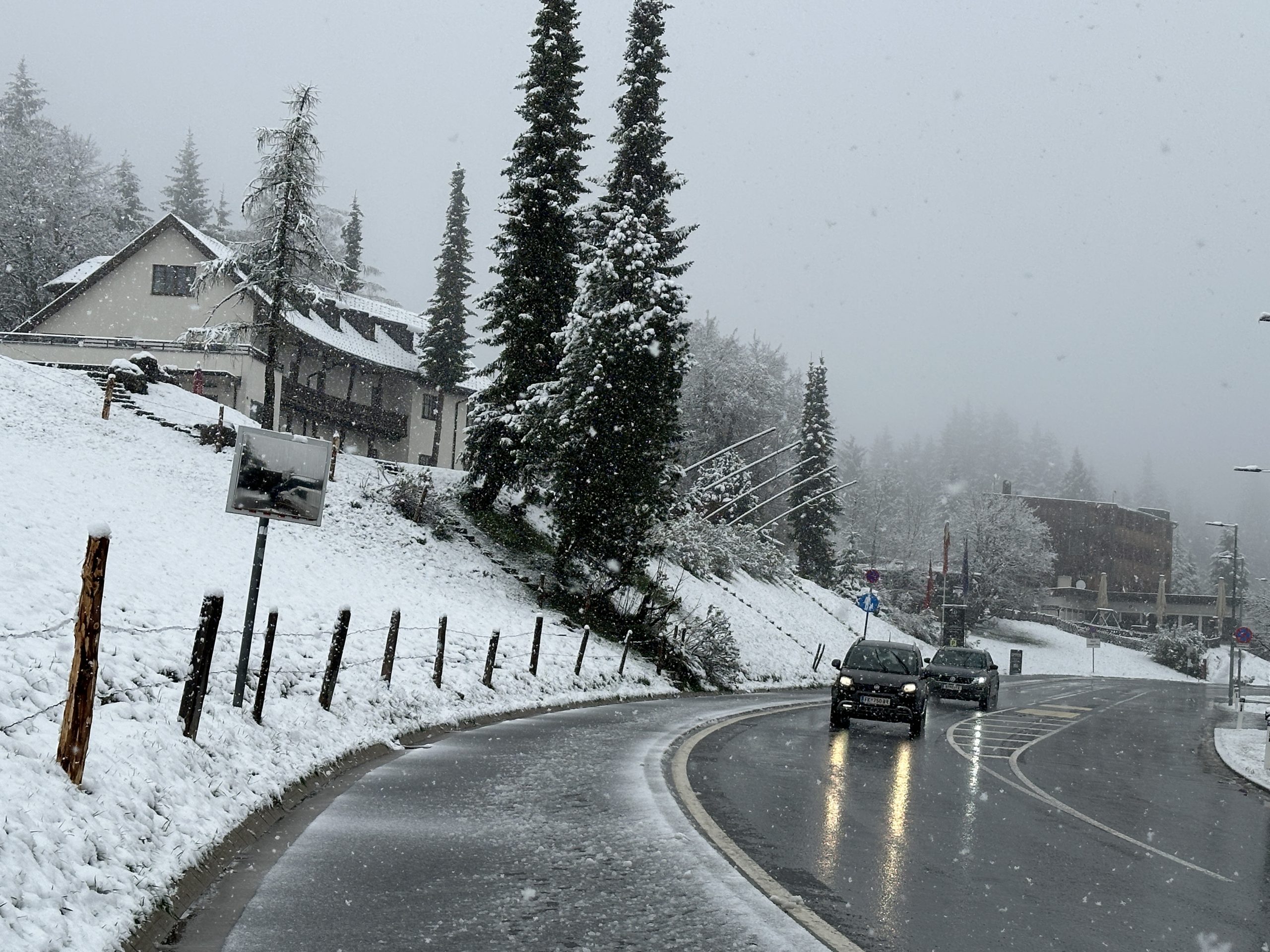 Auch die Schneefallgrenze ist wieder gesunken. Das zeigte sich beim VOL.AT-Lokalaugenschein am Bödele in Schwarzenberg: Während es in den Tälern regnet, zeigen sich die Berge wieder winterlich. Am Mittwochvormittag schneite es am Bödele. Knospende Bäume und blühende Blumen wurden vom Schnee zugedeckt. Auch der Schneepflug war unterwegs.