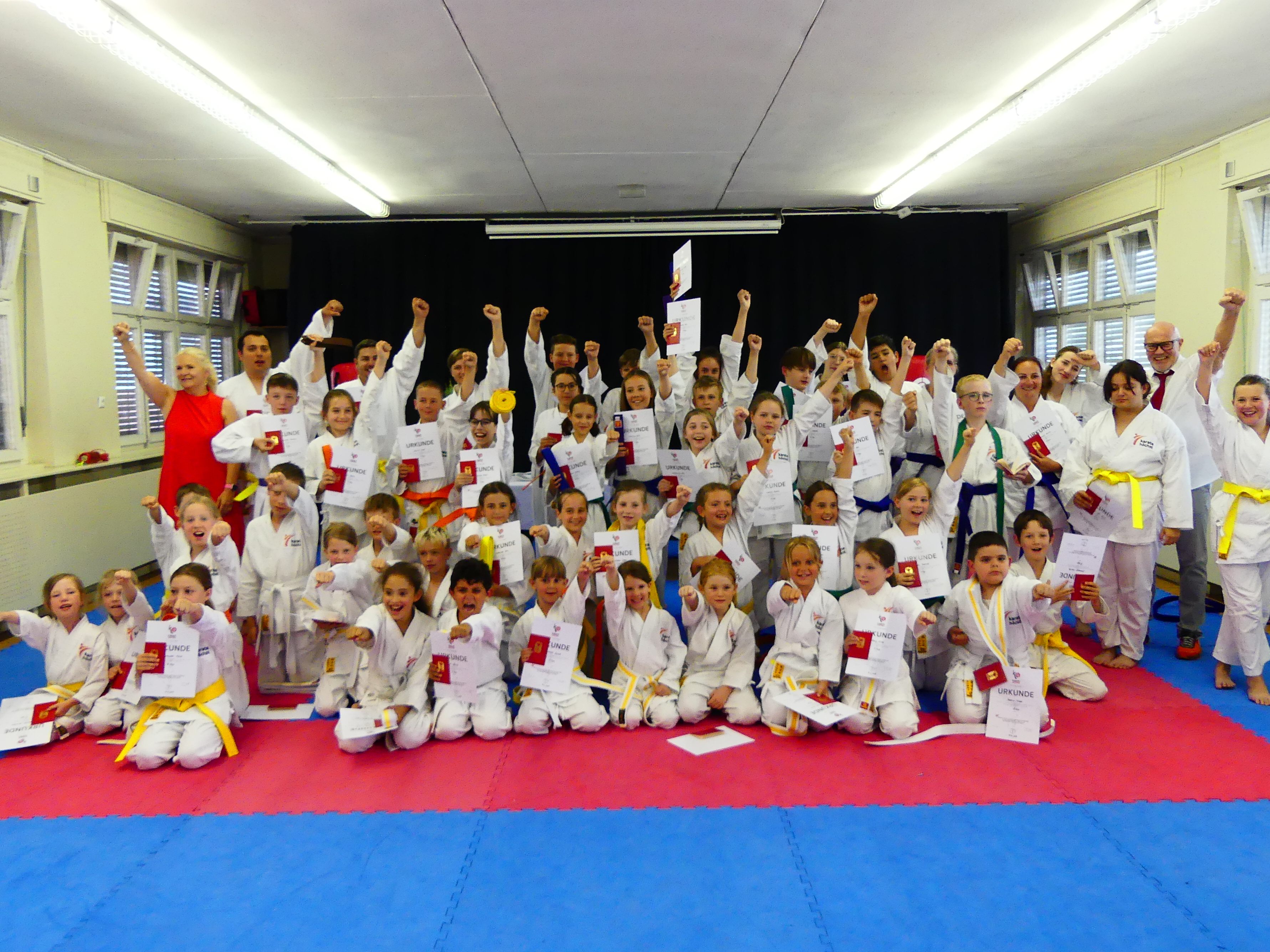 Geprüft wurde Kihon (Grundschule), Kata (Kür) und die Partnerübung (Kumite).Zur Freude der wartenden Eltern konnten alle deren Prüfung erfolgreich bestehen. Bei der anschließender Urkundenübergabe und der Gürtelübergabed gab es dann nur lachende Gesichter.