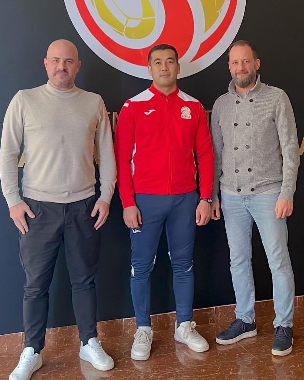 Isky (r.) bei seinem ersten Besuch in der Momunov-Fußballakademie in Osch mit seinem Freund Alexander Bauer (r.) und Azamat Asanbenkov (m.) vom Kirgisischen Fußballverband im Dezember 2023. ©Privat