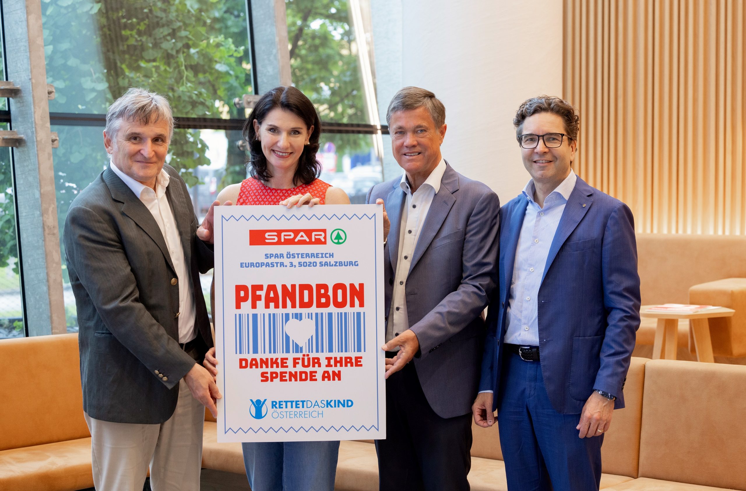 - "Durch die Möglichkeit für unsere Kund:innen die Pfandrückgabe an „Rettet das Kind“ zu spenden, können wir gemeinsam einen positiven Unterschied im Leben vieler Kinder und Familien machen. Somit erhält das Pfand nicht nur eine wichtige Bedeutung für die Umwelt, sondern auch für unser soziales Miteinander. Gemeinsam können wir viel bewegen und eine bessere Zukunft für die nächste Generation schaffen." (Markus Kaser, SPAR-Vorstand)