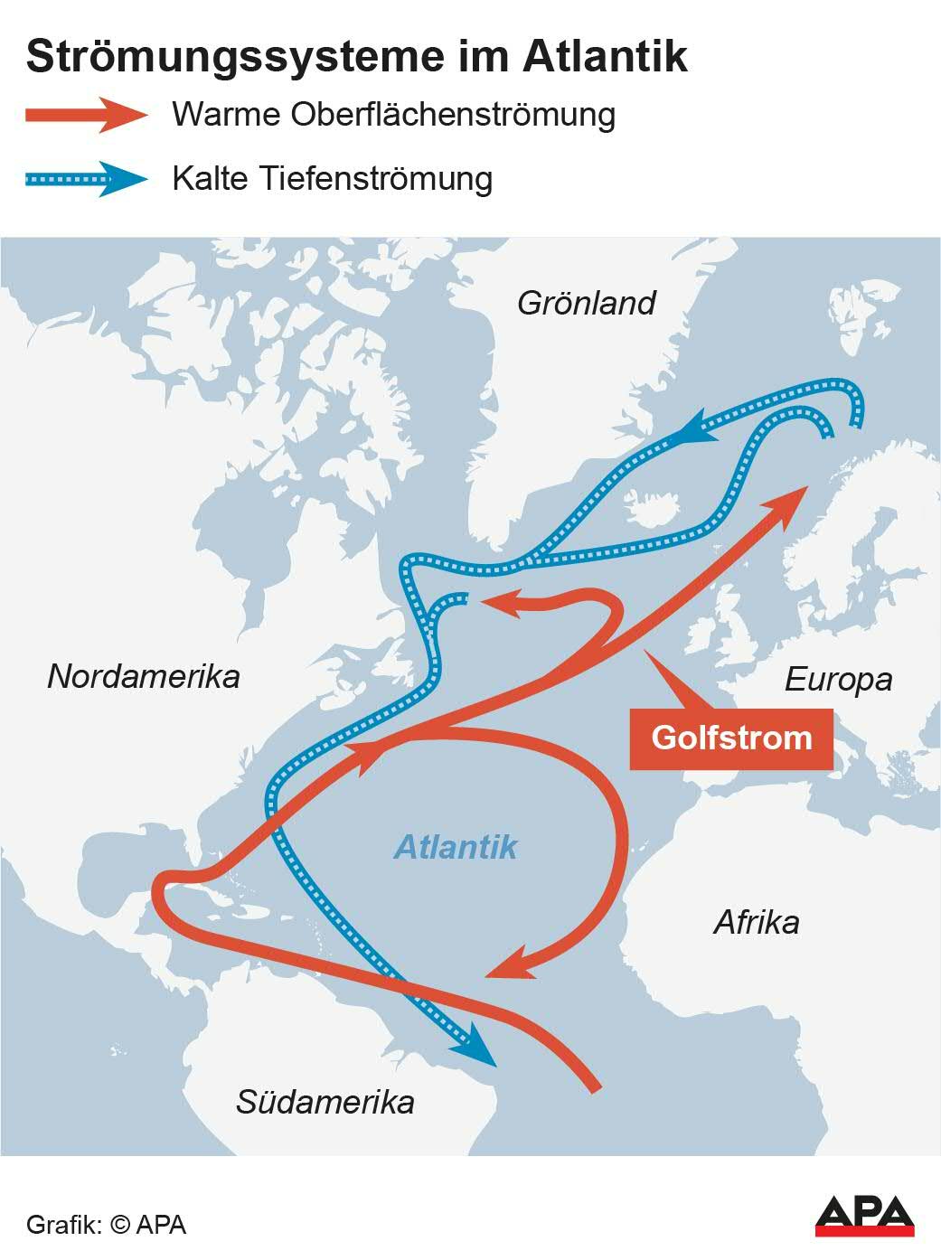 Es besteht die Gefahr, dass sich die Atlantische Umwälzströmung durch die Klimakrise verlangsamt, was Auswirkungen auf den Golfstrom und somit auf das Klima in Europa hat.