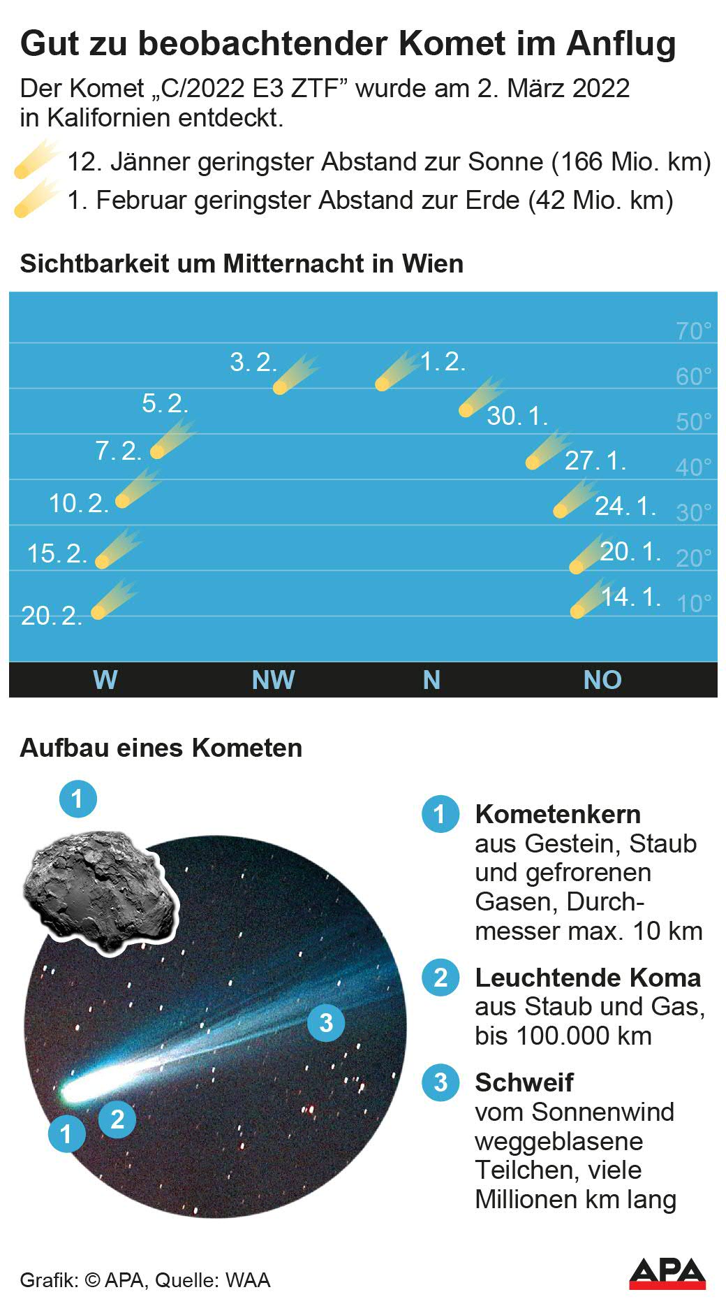 Es wird erwartet, dass der Himmelskörper Ende Jänner seine maximale Helligkeit erreicht. "Derzeit entwickelt sich seine Helligkeit besser als prognostiziert, das schaut sehr gut aus", sagte Alexander Pikhard von der Wiener Arbeitsgemeinschaft für Astronomie (WAA) zur APA.