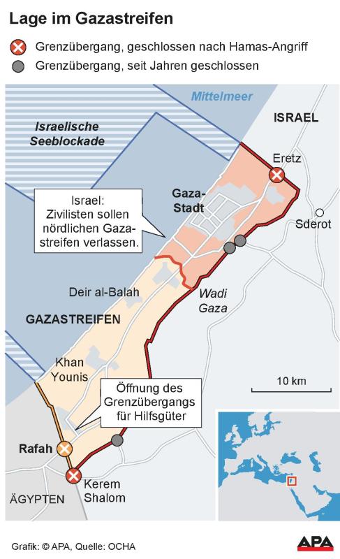 Dringend benötigter Treibstoff wurde nach UNO-Angaben seit Kriegsbeginn bisher nicht in den Gazastreifen gebracht. Die UNO und andere Hilfsorganisationen schlagen Alarm, weil Treibstoff unter anderem dringend zum weiteren Betrieb von Stromgeneratoren in Krankenhäusern benötigt wird. Israel hat aber die Sorge, die islamistische Hamas könnte den Treibstoff für ihre Ziele nutzen.