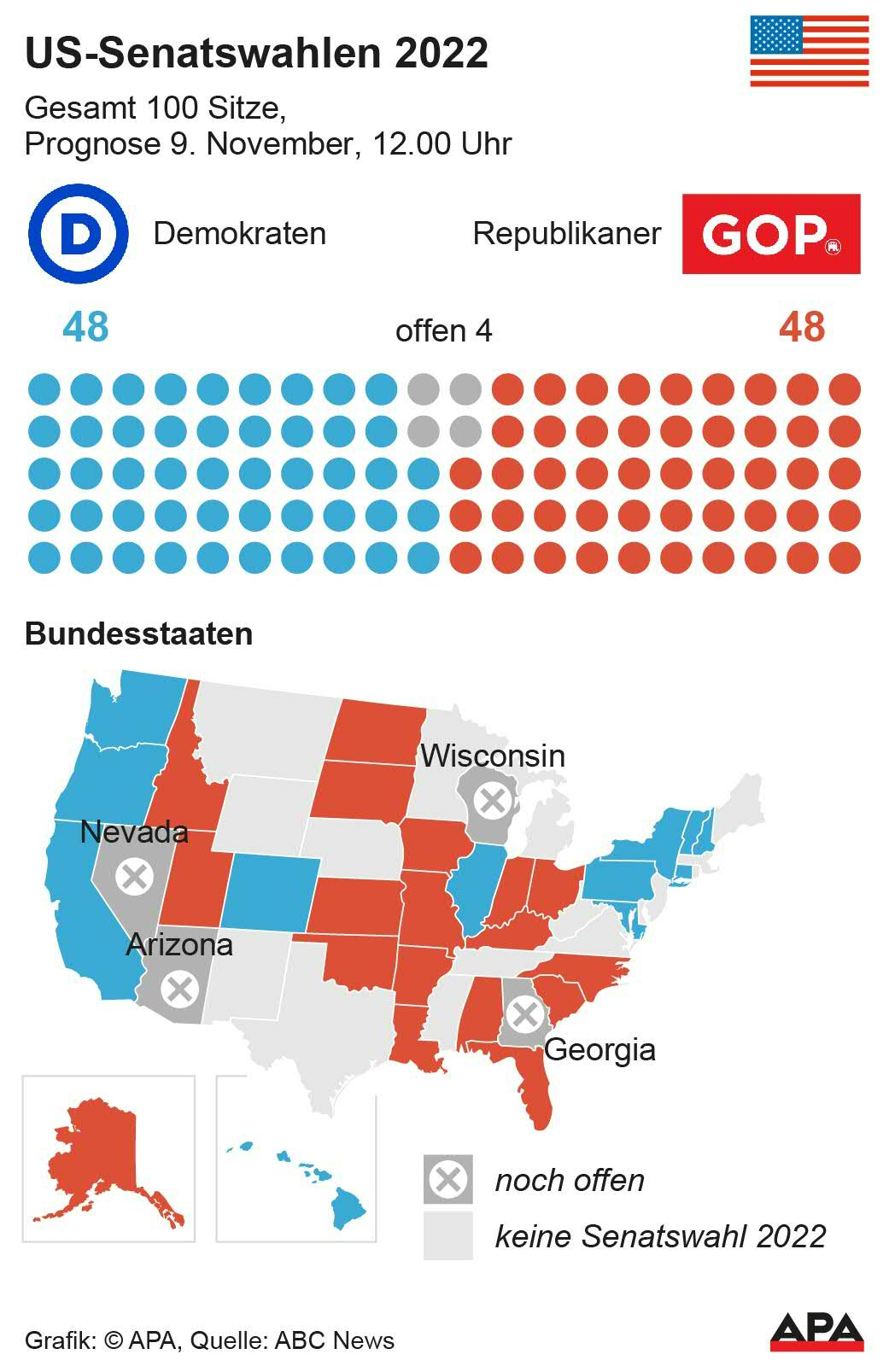 Gebannt blickten die USA auf knappe Rennen um Senatssitze in vier umkämpften Bundesstaaten. In Georgia, Wisconsin, Arizona und Nevada war auch am Mittwochvormittag (Ortszeit) noch offen, ob sich Demokraten oder Republikaner für Mandate im Senat durchsetzen - und wer am Ende die Mehrheit in der Kongresskammer übernimmt. Unklar war vorerst auch, wer künftig das Sagen im Repräsentantenhaus haben wird. Für die Republikaner deutete sich hier ein knapper Vorsprung an.