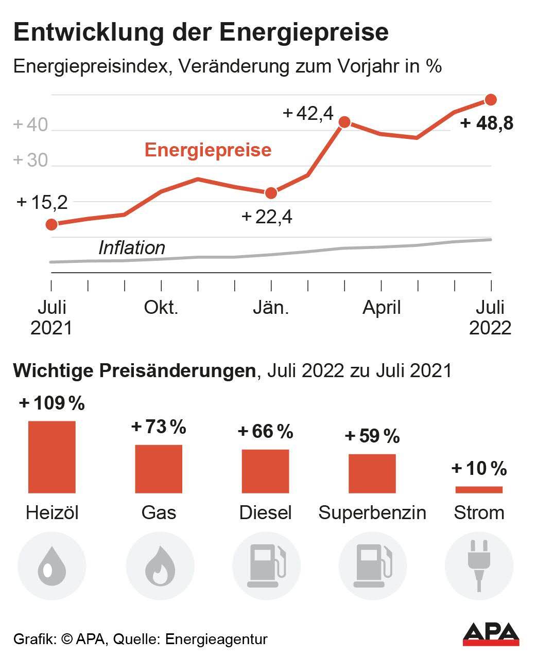 Die österreichischen Haushalte mussten im Juli für Energie erneuert tiefer in die Tasche greifen. Vor allem Heizöl, Holzpellets und Brennholz verteuerten sich, teilte die Energieagentur mit. Bei Strom fielen die Preissteigerungen moderat aus, hier würden Entlastungsmaßnahmen greifen. Zahlreiche Versorger haben allerdings Preissteigerungen angekündigt, die im September schlagend werden dürften.