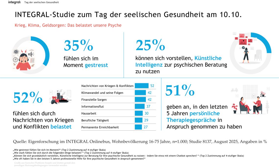 In der Gesamtschau wirkt die Lage laut einer Integral-Umfrage anlässlich des Tags der seelischen Gesundheit (10.Oktober) aber positiv: 85 Prozent sagen, es gehe ihnen mental sehr oder eher gut. "Unter der Oberfläche" zeige sich dann doch ein anderes Bild: 35 Prozent fühlen sich demnach aktuell gestresst, Junge deutlich mehr als die Älteren.
