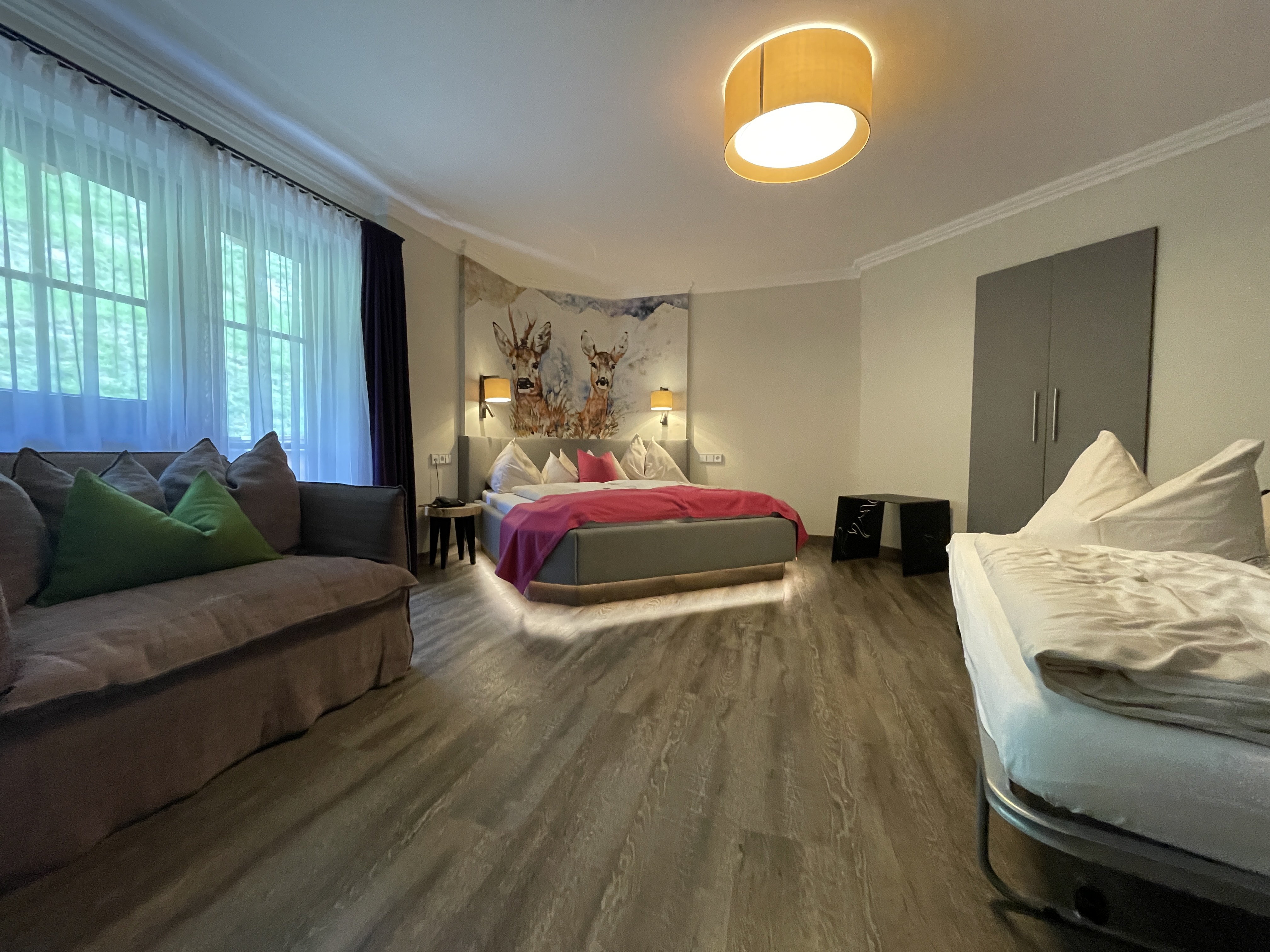 Der positive Eindruck beginnt bei der Ankunft in unserem Doppelzimmer "Kohlmais/Reiterkogel", wo auf geräumigen 30 Quadratmetern Tradition auf Moderne trifft und ein besonderes Flair von Gemütlichkeit kreiert. Frische, kräftige Farben vereinen sich mit Wild-Gemälden an der Wand, rustikale Elemente aus Echtholz bestehen neben cleveren Details wie einem begehbaren Wandschrank. Das Bad, hell und zeitgemäß mit schöner Wanne, aber separatem WC sorgt dafür, dass Familienbedürfnisse nebeneinander ausgelebt werden können, ohne sich auf die Zehen zu treten. Einfach ein Platz zum Wohlfühlen. Und als wir uns die Räumlichkeiten des Hotels "Die Sonne" näher ansehen, sind nicht nur die Kinder hellauf begeistert, was Familien hier alles "anstellen" können.