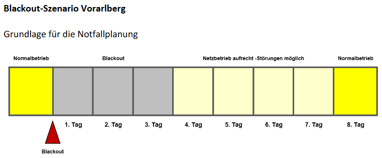 Vorarlberg befindet sich dank der Wasserkraftanlagen der Illwerke in einer "außergewöhnlichen, komfortableren Position", sollte es zu einem großflächigen, längerfristigen Stromausfall kommen. Die Kraftwerke wären zu einem sogenannten "Schwarzstart" in der Lage, die Illwerke könnten dann binnen Stunden einen Inselbetrieb aufbauen. "Vorarlberger Haushalte und Wirtschaft gehen im Ernstfall vor. Das können wir, weil wir Eigentümer des Unternehmens sind", verdeutlichte Landeshauptmann Markus Wallner (ÖVP), der darum bat, die Broschüre und die darin enthaltenen Anweisungen ernst zu nehmen, denn: "Passieren kann 's immer".