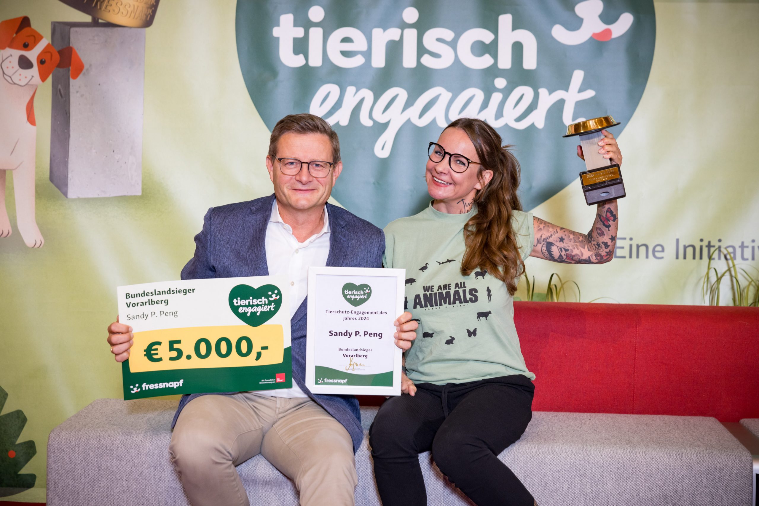 Auch Sandy P. Peng aus Vorarlberg ist unter den Preisträgern. Sie ist seit über 17 Jahren im Tierschutz aktiv und wurde nun mit dem "Goldenen Fressnapf" als Bundessiegerin für das Ländle ausgezeichnet. Peng setzt sich mit ihrer Arbeit für die Rettung und Versorgung von Tieren ein. Auch beim "Verein gegen Tierfabriken" (VGT) ist sie aktiv. Zudem betreibt sie seit 2015 auch ein eigenes Label für vegane Mode, das bereits von der Tierschutzorganisation PETA ausgezeichnet wurde. Neben dem physischen Award würdigt Fressnapf die Tierschützerin und ihr Engagement mit einer Spende von 5.000 Euro.