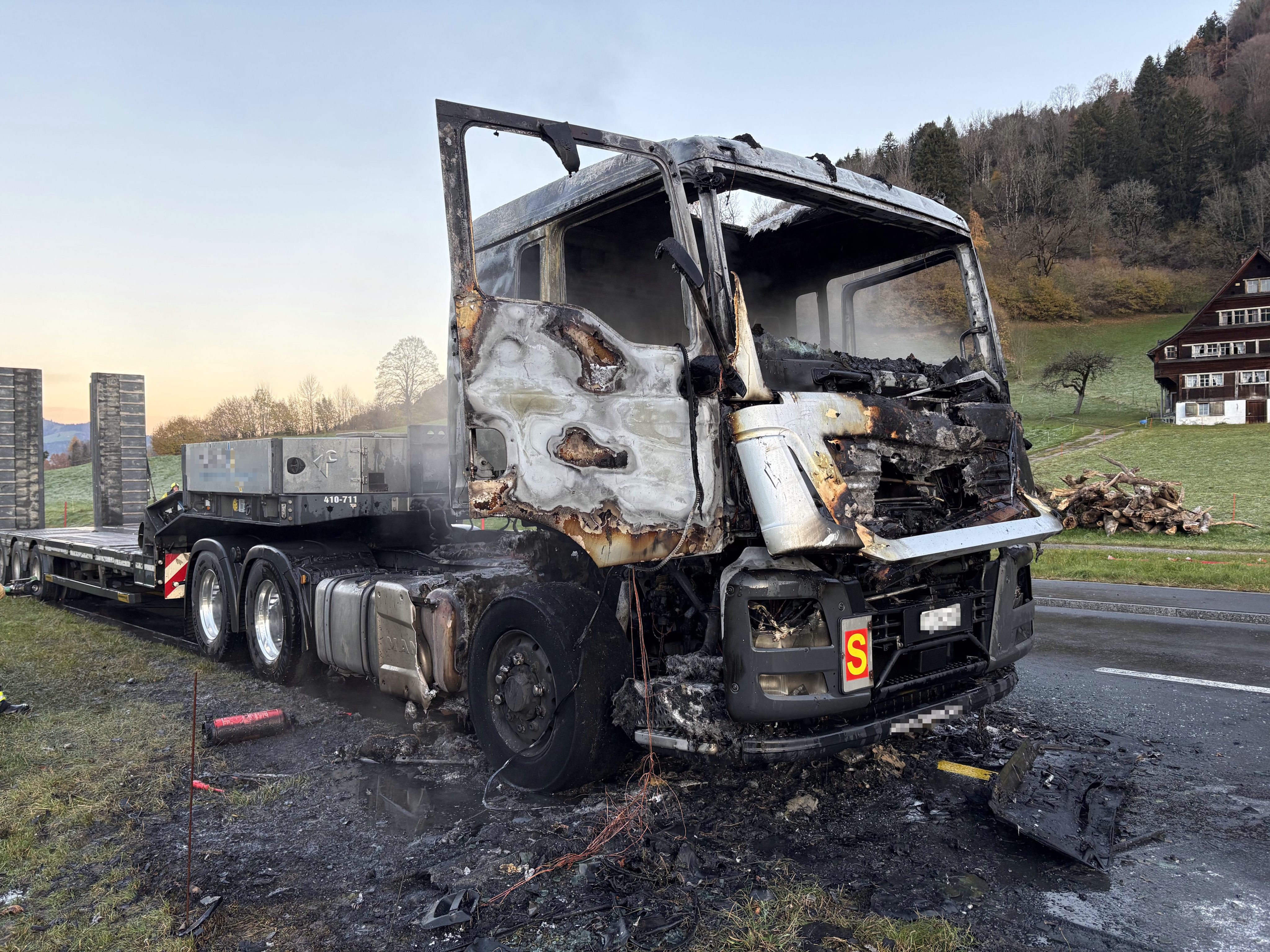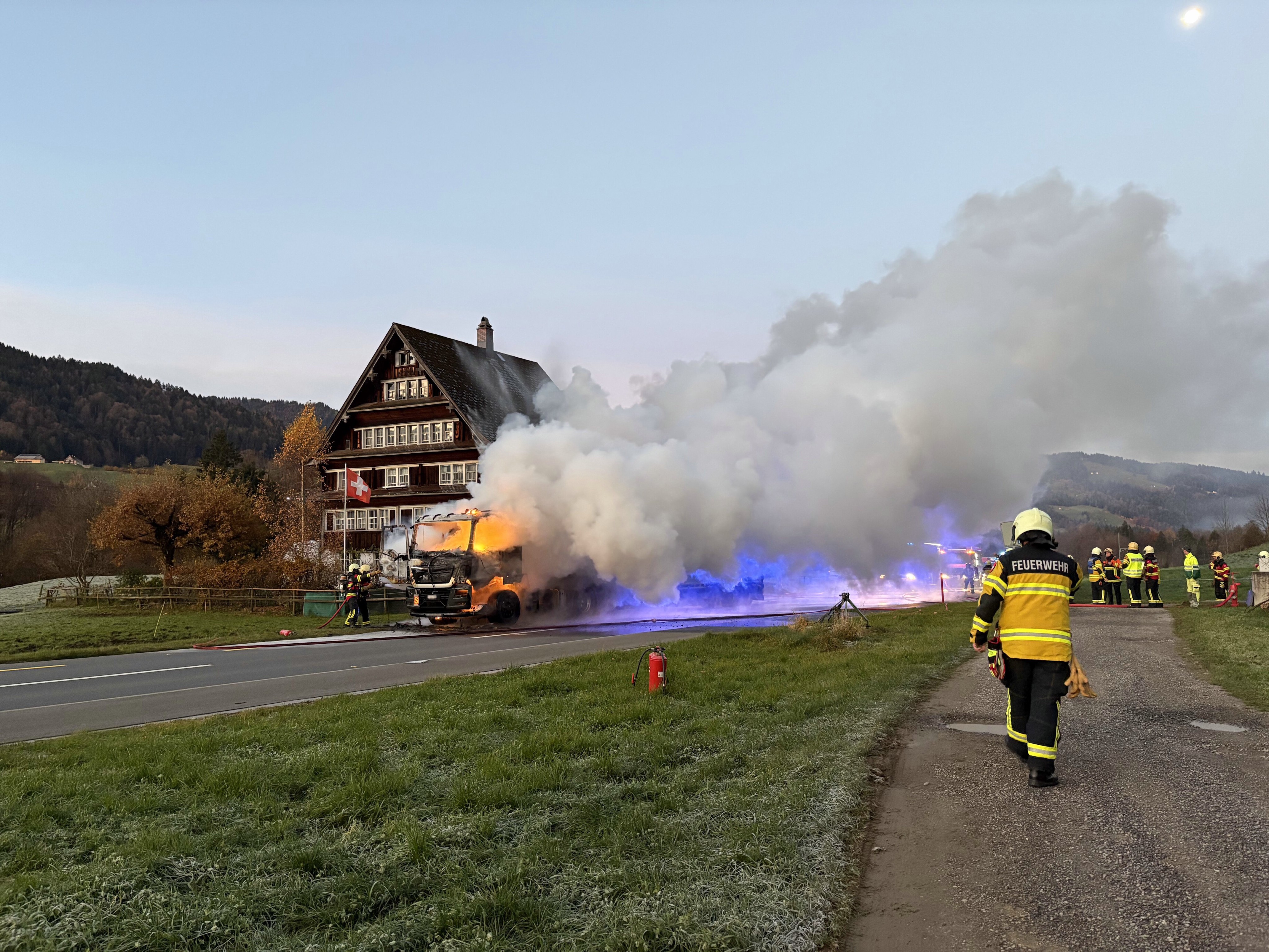 Am Freitag, den 7. November 2025, gegen 6:40 Uhr, fuhr ein 35-jähriger Mann mit seinem Lastwagen auf der Umfahrungsstraße in Ebnat-Kappel, als er plötzlich einen lauten Knall aus dem Bereich der Fahrzeugfront hörte. Der Fahrer reagierte geistesgegenwärtig, hielt das Fahrzeug sofort an und verließ die Kabine. Nur wenige Augenblicke später schlugen bereits Flammen aus dem Führerhaus.