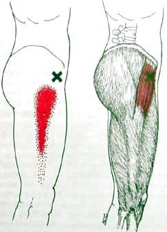 Viele Läufer klagen auch über Schmerzen auf der Beckenaußenseite, beziehungsweise dem Bereich des Oberschenkelknochens, den man auch Trochanter major (großer Rollhügel) nennt. Man kann diesen Knochenpunkt an der Oberschenkelaußenseite auf Höhe der Leiste tasten. Hier führen häufig Muskel- oder Schleimbeutelreizungen zu schmerzen, die dann auf der Außenseite des Oberschenkels bis zum Knie ziehen können. Lauftechnik und Beinachsenstellung sollten bei diesen Beschwerden beachtet werden. Verspannungspunkte im M.tensor faciae latae , einem Hüftmuskel, können das typische schnappende Geräusch im Bereich des Trochanter major verursachen, den Schneidersitz schmerzhaft machen, oder Schmerzen beim Liegen auf der betroffenen Seite auslösen. Häufig wird auch ein tiefer Schmerz im Hüftgelenk beschrieben und es kommt zu Verwechslungen mit Hüftarthrosen. Aktivierende Mechanismen für diese Verspannungen sind vor allem Läufe auf schiefer Ebene oder Landungen auf einem Bein nach Sprüngen. Dehnungen und Massagen können hier Abhilfe schaffen.