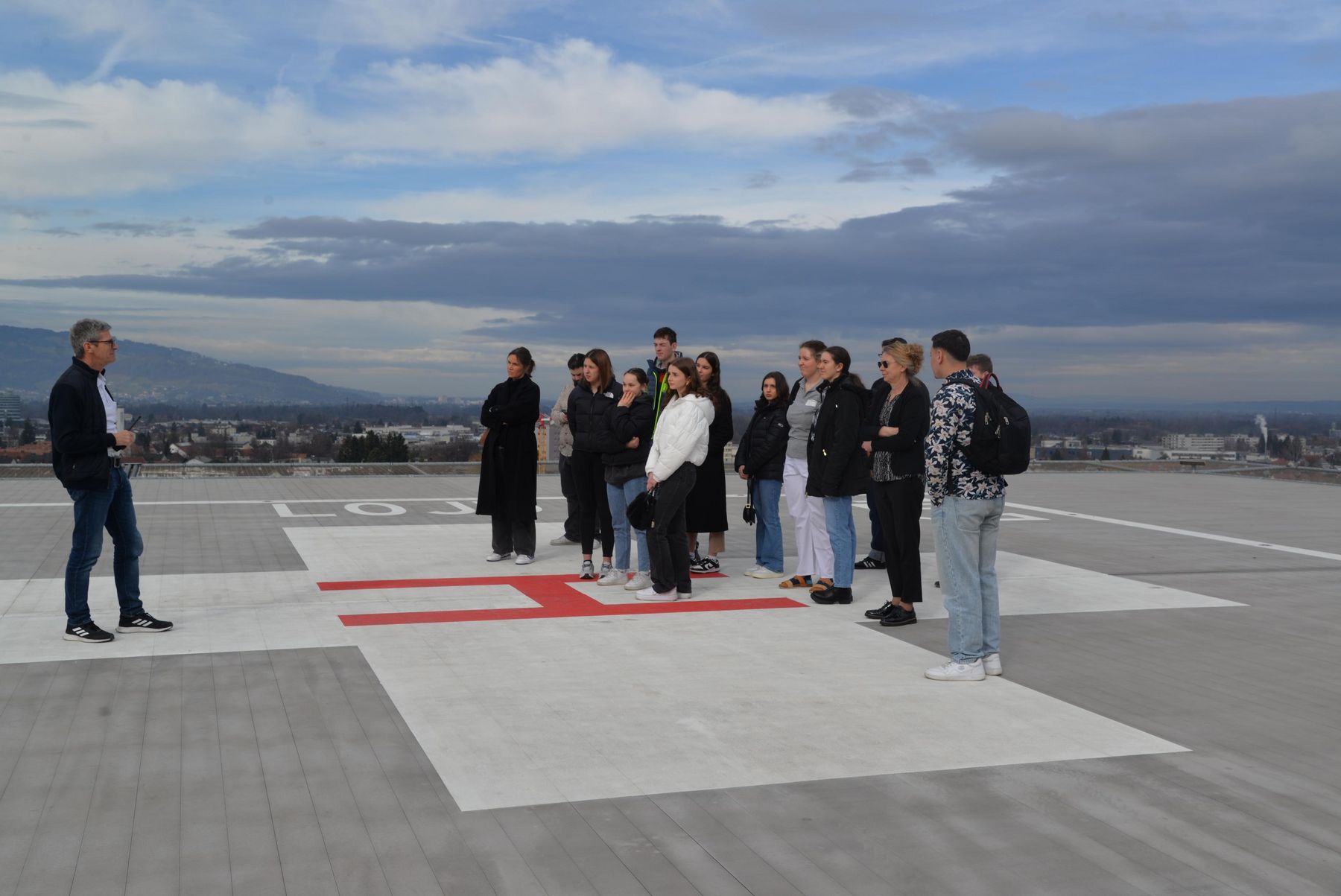 Die Krankenhausküche wurde für seine Qualität und Regionalität von „Vorarlberg isst“ mit zwei Gabeln ausgezeichnet. Pascal Hollenstein zeigte seine digitale Arbeitswelt im IT-Bereich und gab Einblicke in den Serverraum und die vielen Schnittstellen, die von der Informatik betreut werden. Über die Notfallambulanz ging es aufs Dach zum „höchsten“ Arbeitsplatz im städtischen Krankenhaus. Auf 60 Meter Höhe erklärte Flugplatzbegleiter Peter Palombo die technischen Besonderheiten des 22 Meter langen und 29 Meter breiten Landesplatzes. Er ist mit seinem Team verantwortlich, einen reibungslosen und sicheren Flugbetrieb zu gewährleisten. Im vergangenen Jahr sind 155 Hubschrauber am städtischen Krankenhaus gelandet.