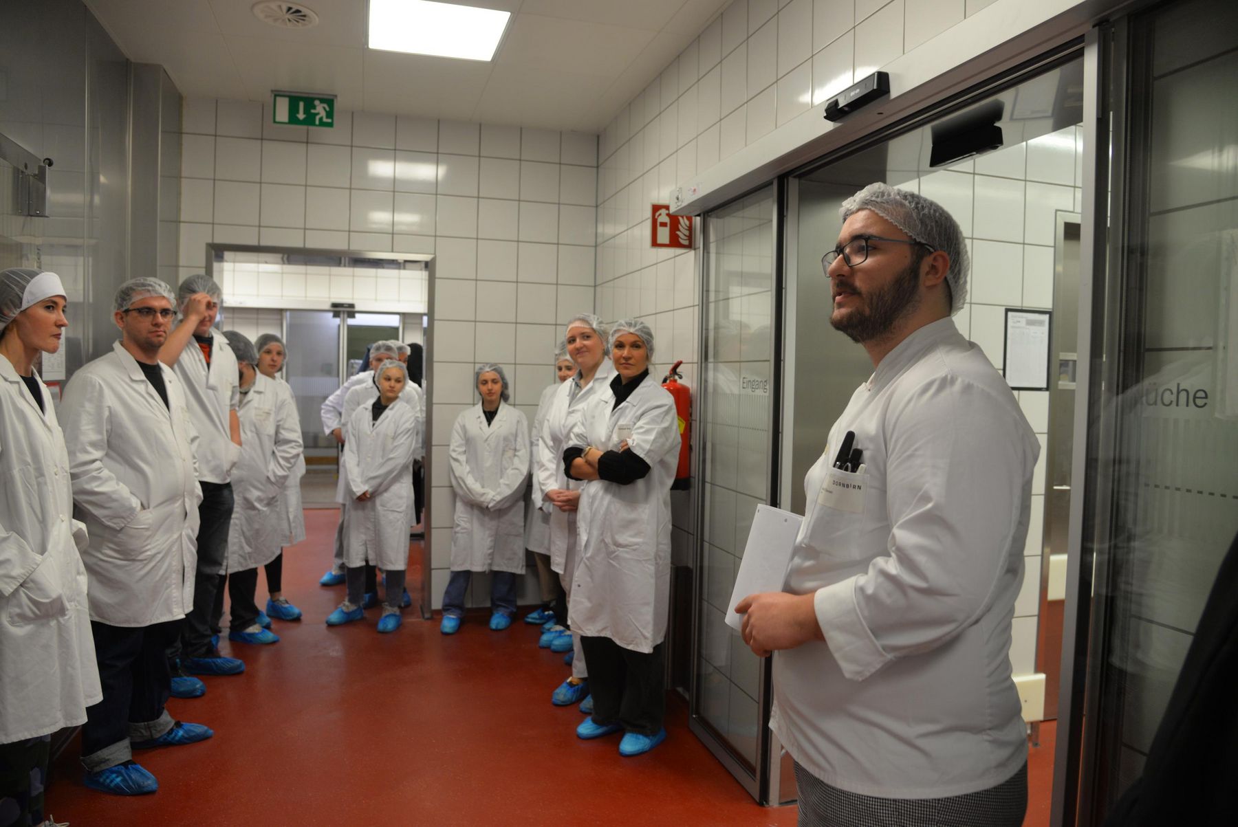 Mit 180 Berufsfeldern an rund 90 Standorten bietet die Stadt Dornbirn vielfältige Arbeitswelten. In den unterschiedlichen Abteilungen und Betrieben sind rund 2.100 Mitarbeitende für die bevölkerungsreichste Stadt in Vorarlberg im Einsatz. Darunter das städtische Krankenhaus als wichtiger Gesundheitsversorger in der Region. Einblicke in den Alltag der Krankenhausküche gab Koch-Lehrling Justin Dünser seinen 14 Ausbildungskolleg:innen. Er erklärte die Hygienevorschriften und zeigte den Weg der Lebensmittel von der Anlieferung bis zur Verarbeitung. Rund 400.000 Mahlzeiten pro Jahr werden hier von der Küchenmannschaft zubereitet. Dabei verarbeitet Küchenchef Torsten Kappei mit seinem Team bis zu 200 Tonnen Lebensmittel.