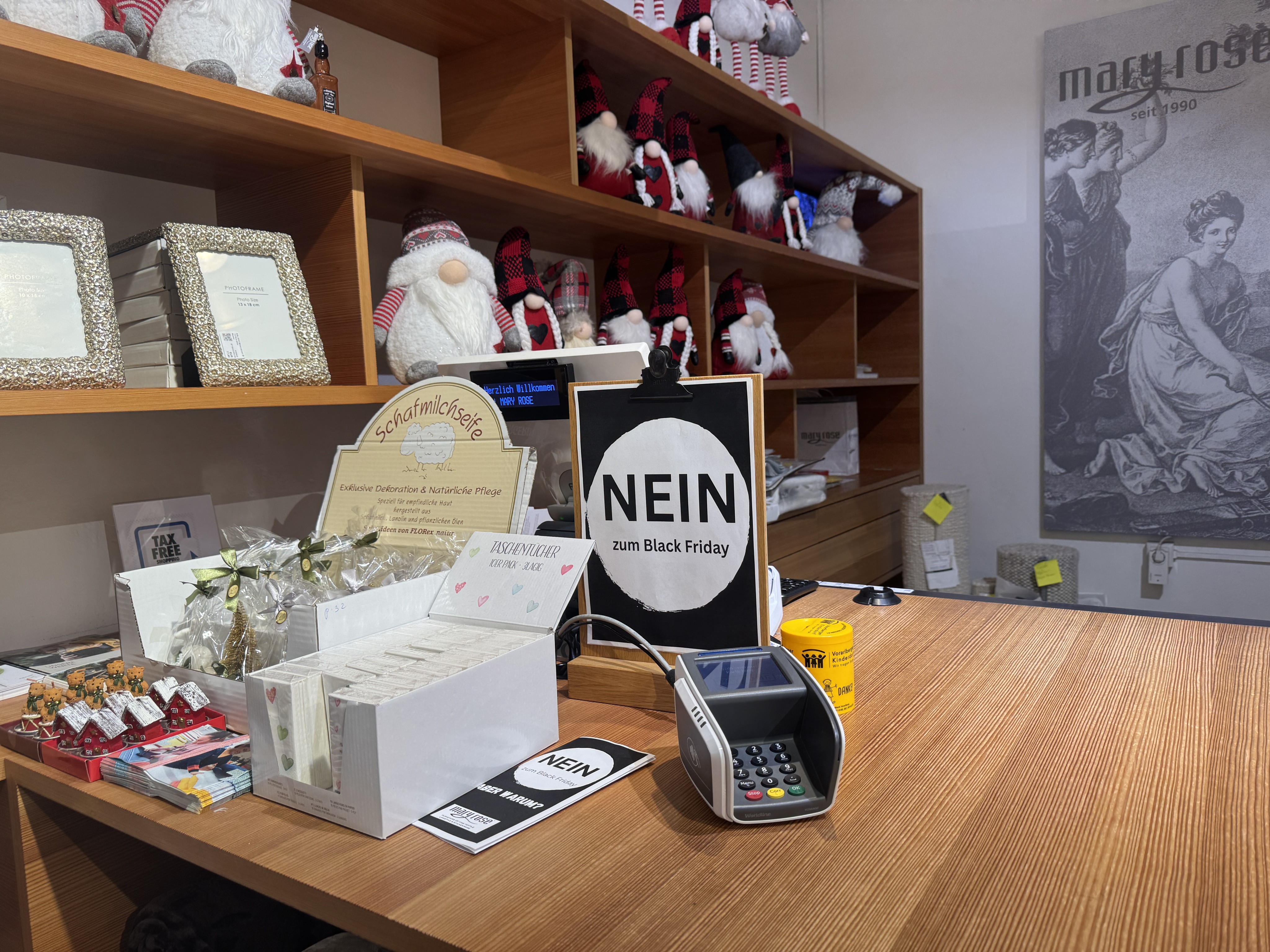 Viele kleine Vorarlberger Läden machen beim Black Friday nicht mit und nehmen bewusst Abstand von der globalen Rabattschlacht. Der Heimtextilienhändler Mary Rose hat ein schwarzes Schild im Schaufenster und ein Social-Media-Video, in dem er klarstellt: "Nein zu Black Friday".