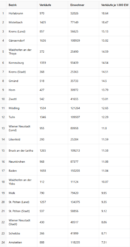 The respective bottom ranks in the ranking are Waidhofen an der Ybbs with 112 sales and Amstetten with 7.51 sales per 1,000 inhabitants, thus the westernmost districts of Lower Austria. The following table provides an overview of all districts in Lower Austria.
