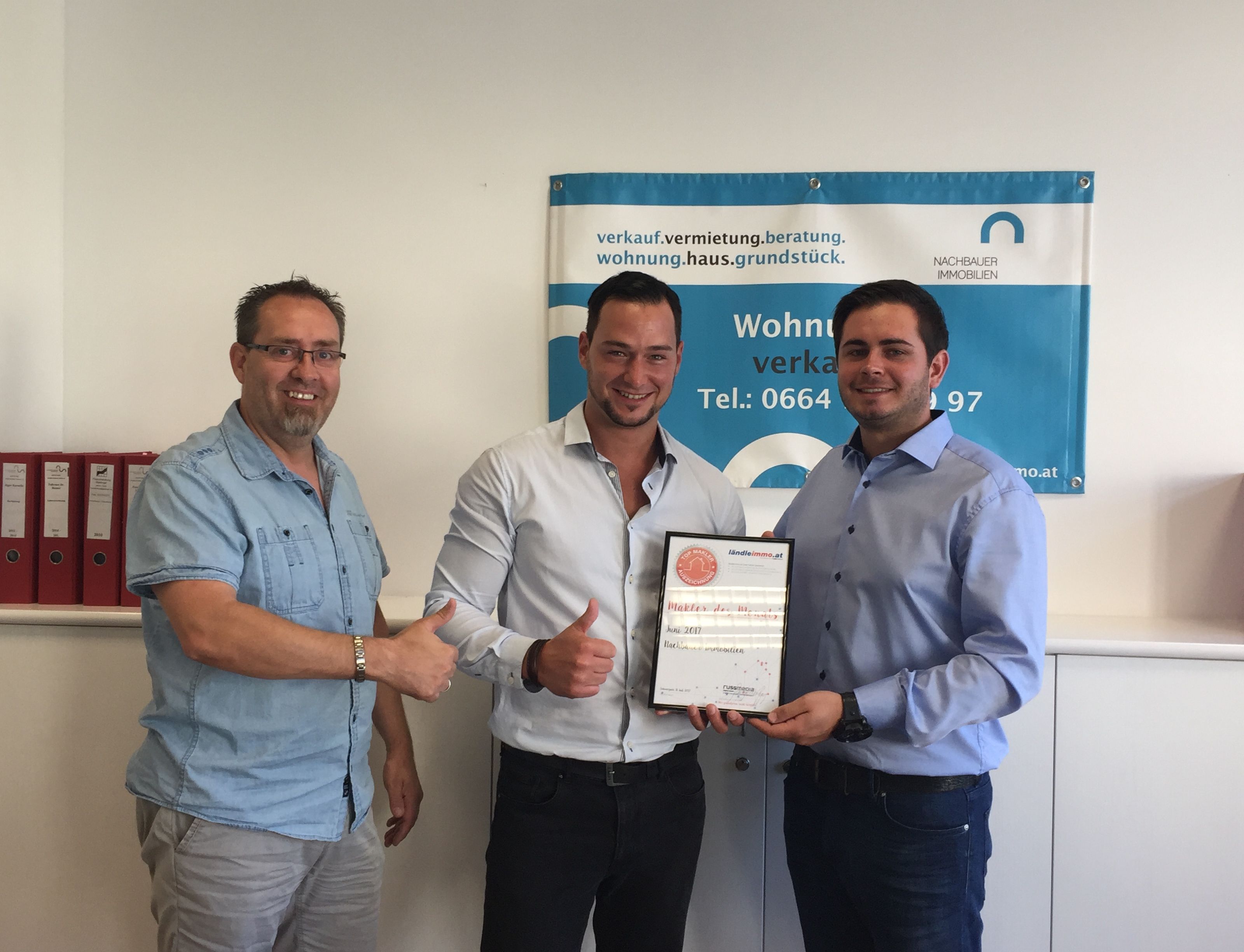 Wolfgang Seeberger von ländleimmo.at durfte dem am besten bewerteten Immobilien-Makler gratulieren und eine Urkunde überreichen. Im Juni konnte Nachbauer Immobilien in Altach den Titel für sich gewinnen. Die Freude war groß. Zu Recht, denn durch Engagement und Fachkompetenz wurde bei den Immobilien-Interessenten gepunktet – eine stolze Leistung!