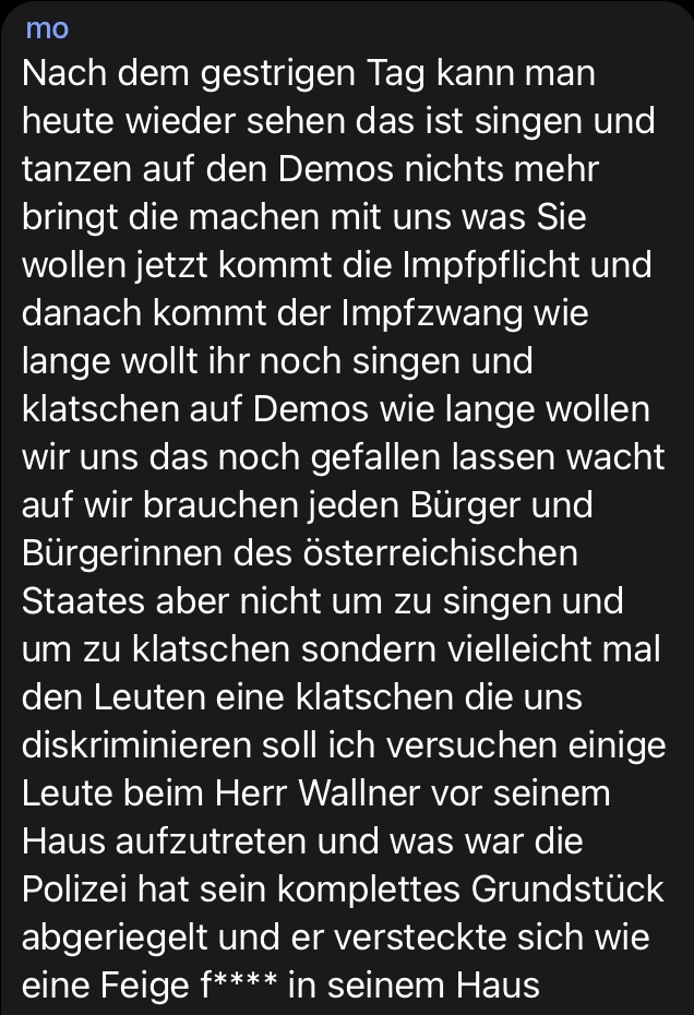 Während in der Vergangenheit bereits Politiker in Deutschland mit Fackelaufmärschen und Protesten an ihren Privatadressen konfrontiert waren, scheinen sich nun offensichtlich auch verschiedene Teile der Vorarlberger Querdenker-Szene immer mehr zu radikalisieren. In den einschlägigen Foren finden sich hierbei neben derartigen Aufrufen auch vermehrt mehr oder weniger indirekte Gewaltandrohungen.